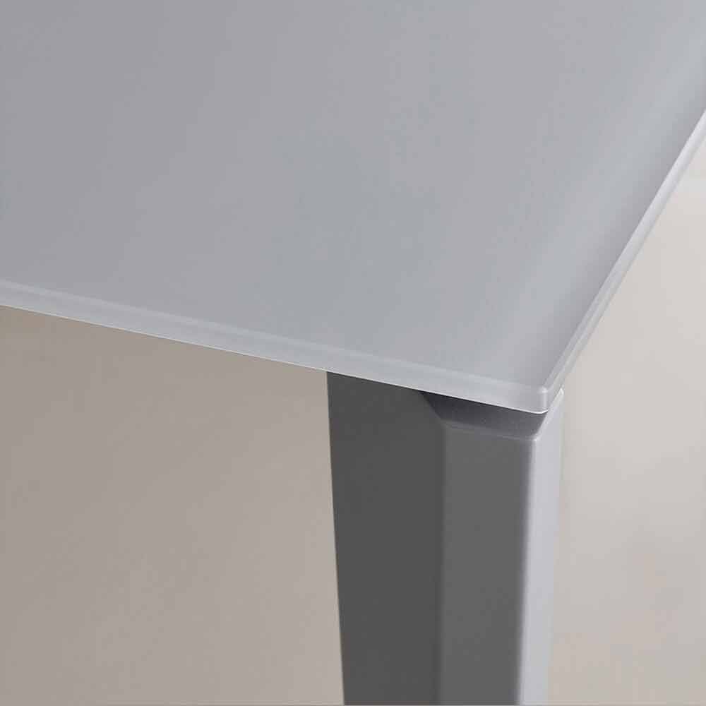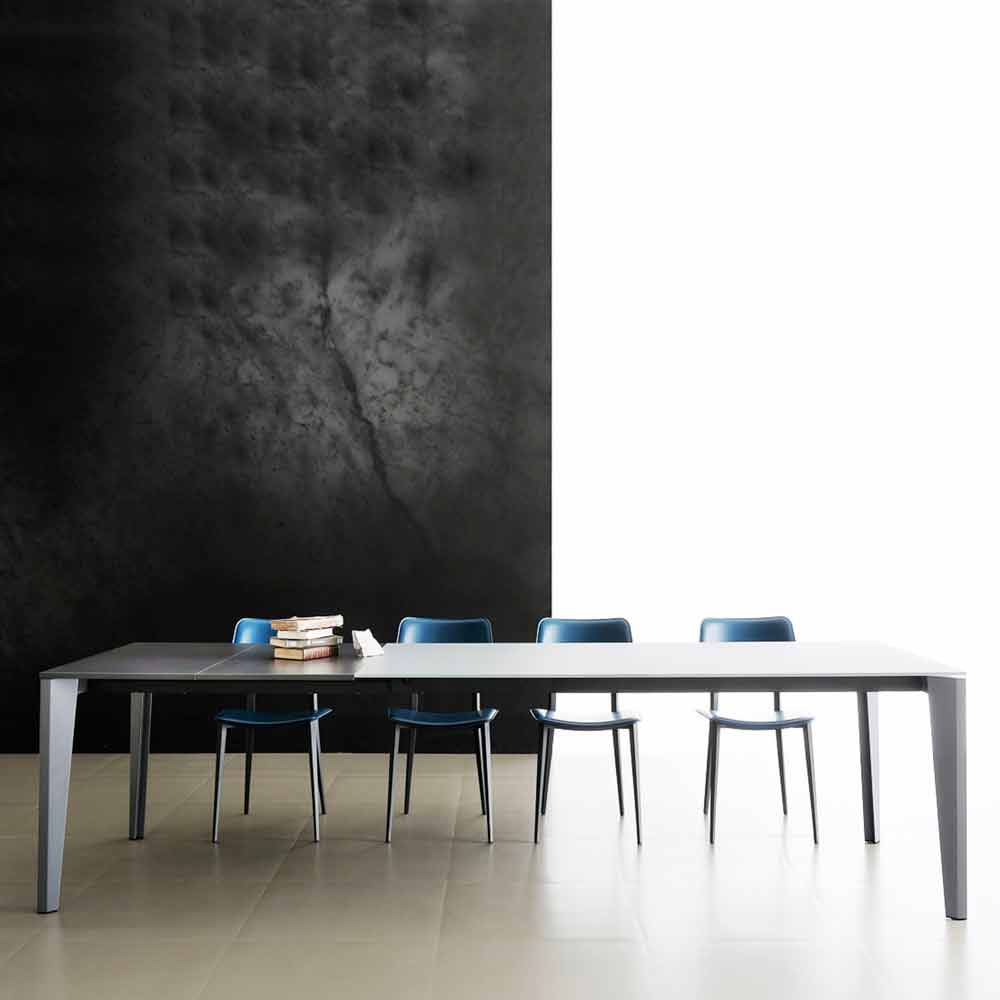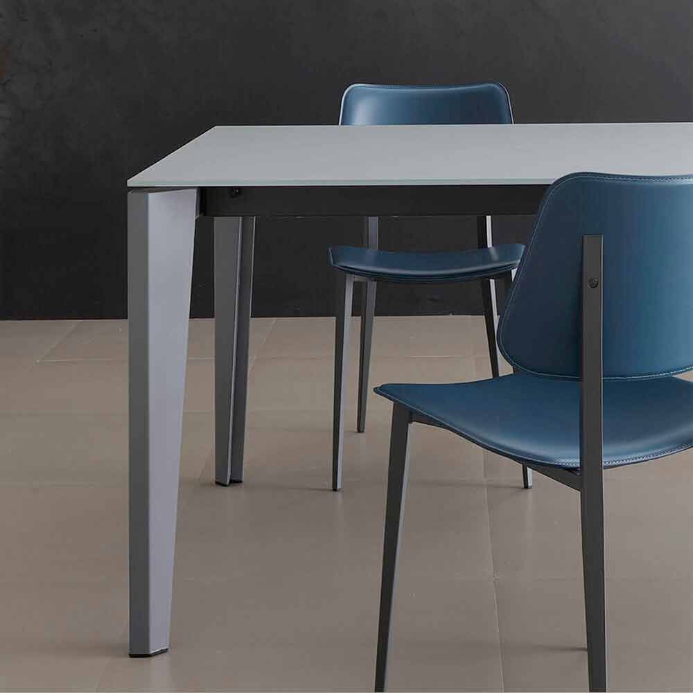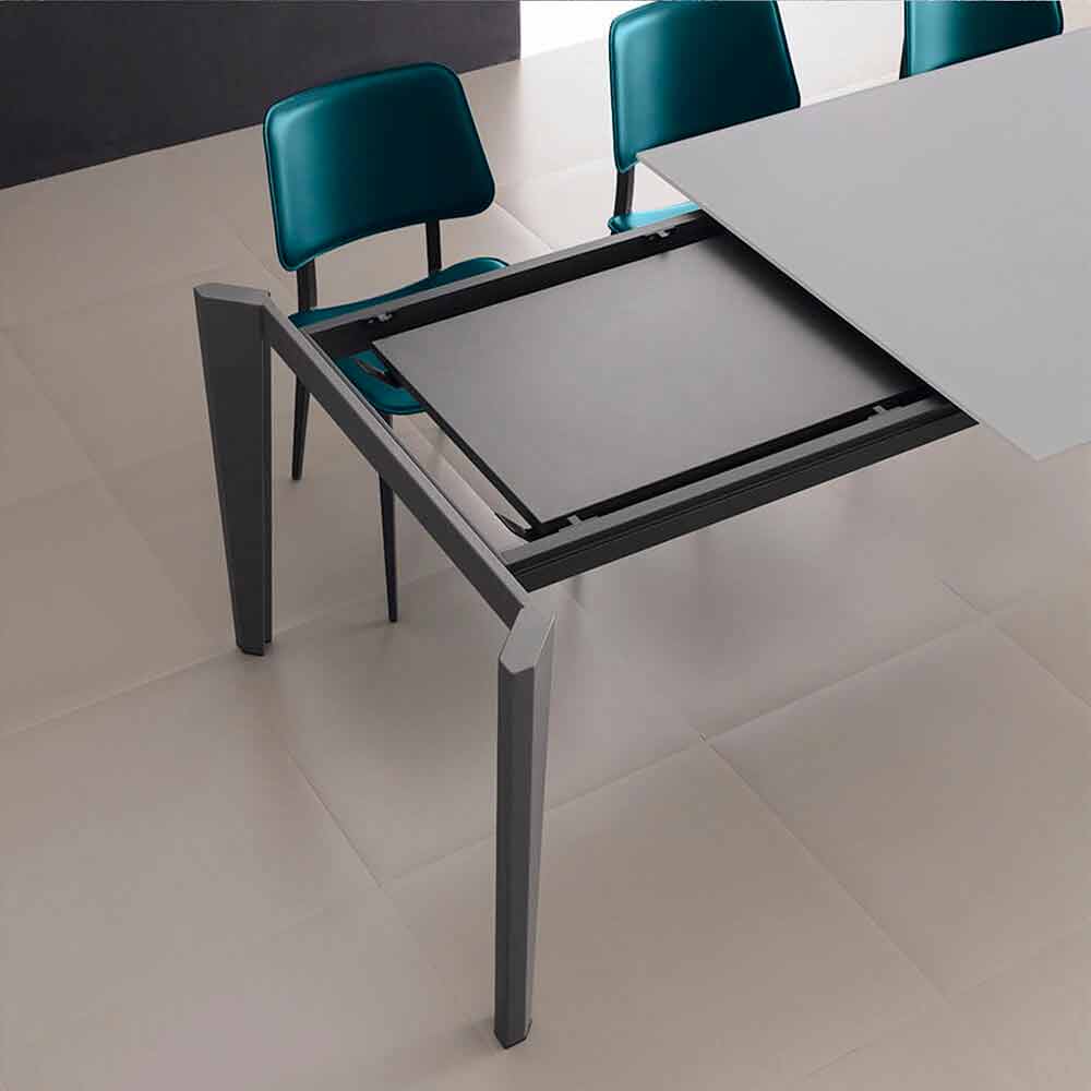 Jídelní stůl vyrobený v Itálii s výsuvnou deskou ze satinovaného skla proti otiskům prstů (tl. 10 mm) s práškovou povrchovou úpravou, nástavec z antracitového melaminu a podstavec z antracitově lakovaného kovu .