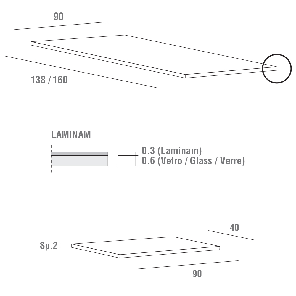 - D 160/200/240 x H 90 x V 76,5 cm.