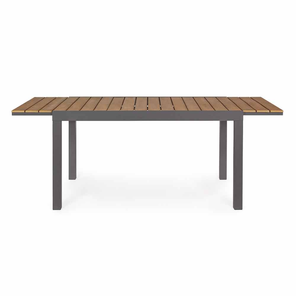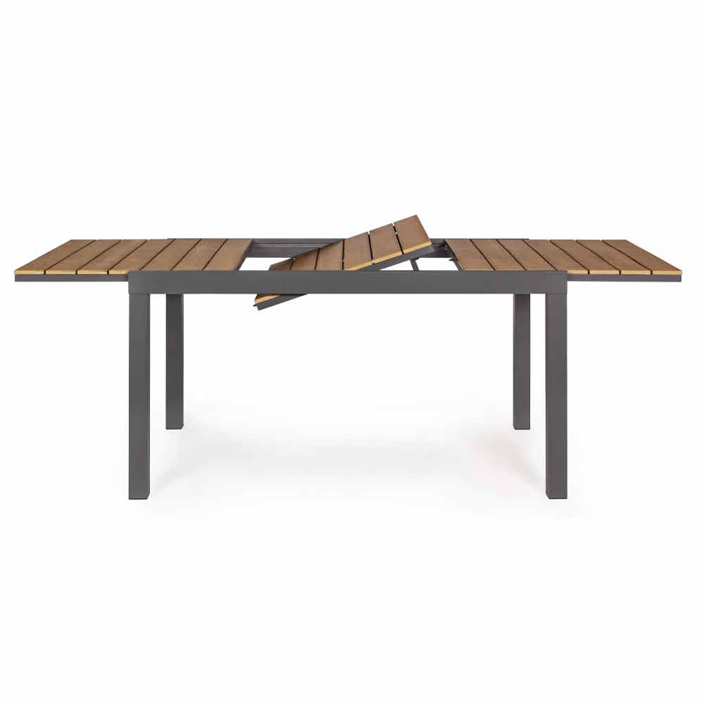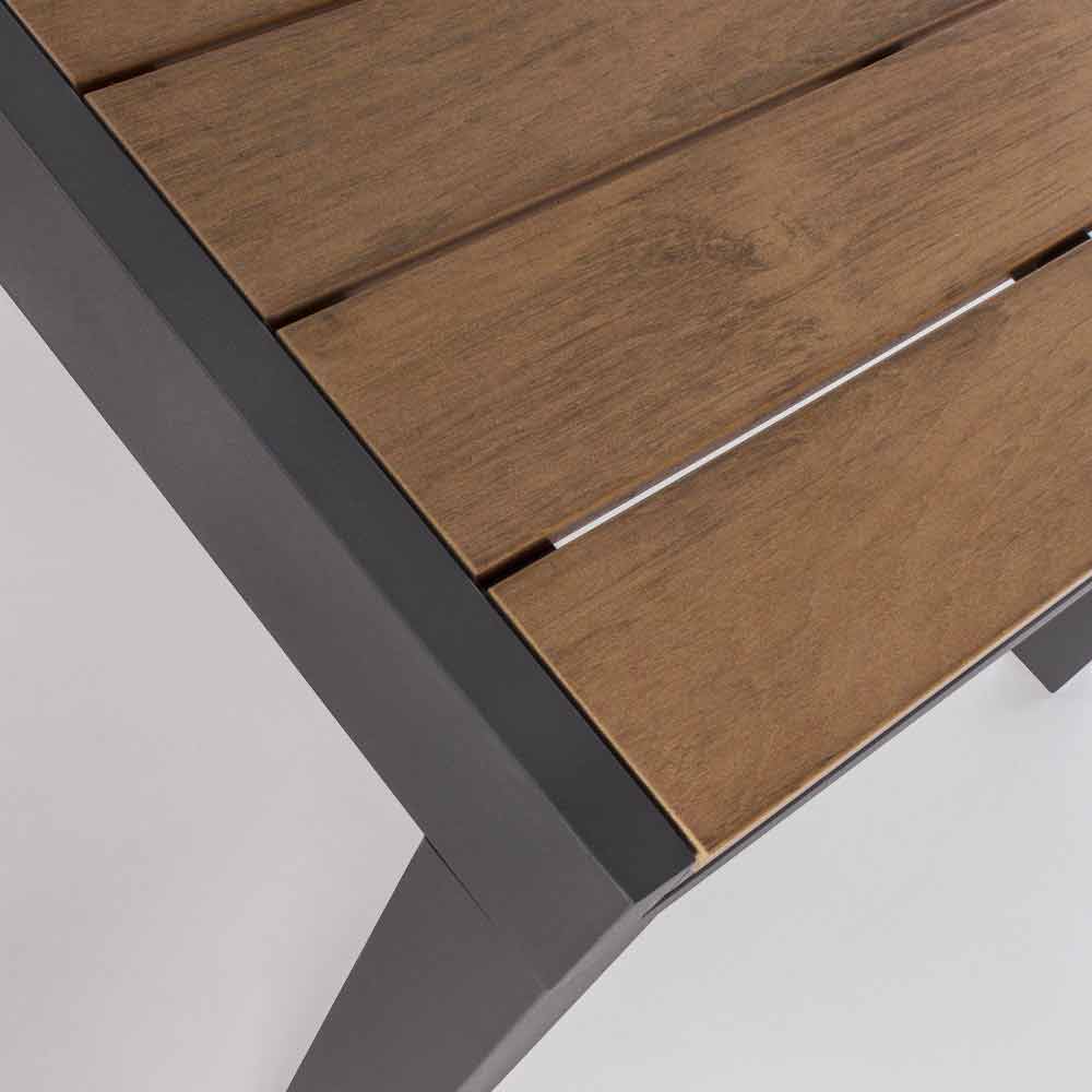 Práškově lakovaná hliníková konstrukce (polyester). Vrchní deska z polywoodu (kompozitní materiál s podobným vzhledem jako dřevo) 90% polystyren 10% sbs teaková barva. Skládací nástavec. Šrouby z pozinkované oceli.