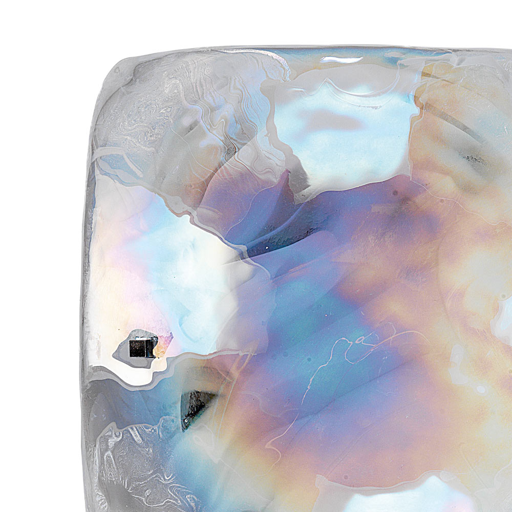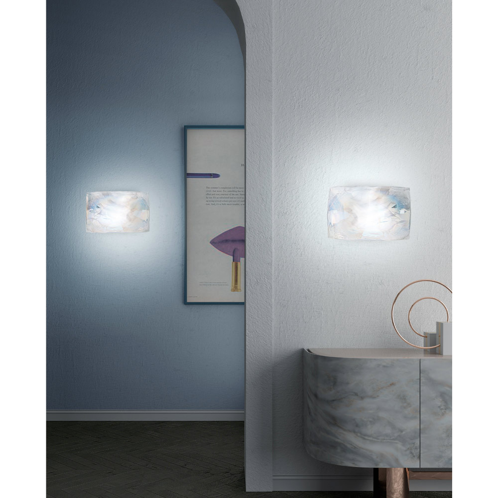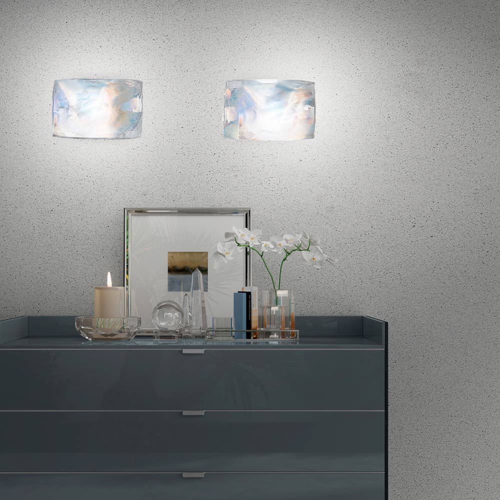 pruhovaného bílého tabulového skla s dekorem iris (efekt perleti), které dodává prostředí nádech rafinované elegance díky zvláštní struktuře a nebývalému vizuálnímu efektu vytvořenému sklem pro jedinečný výsledek s velkou osobností.