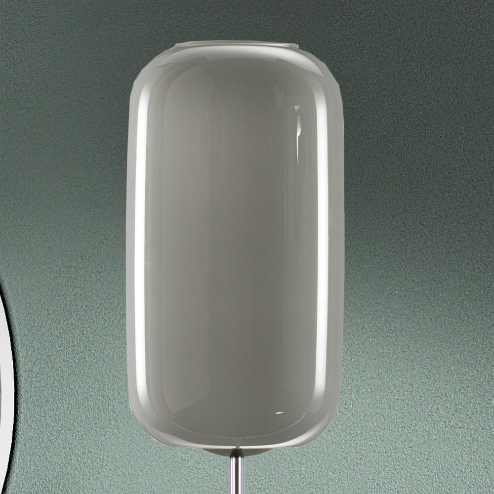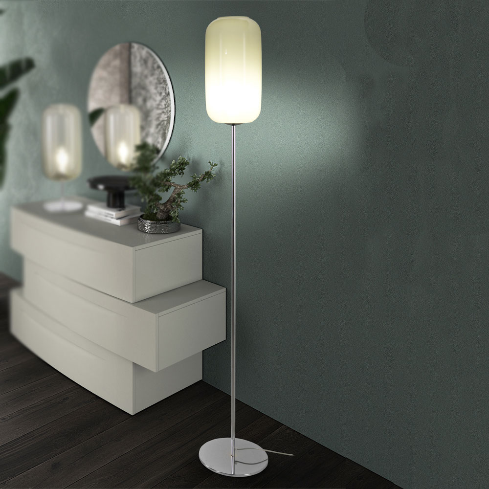 Moderní ručně vyráběná stojací lampa z foukaného benátského skla s kovovou základnou.