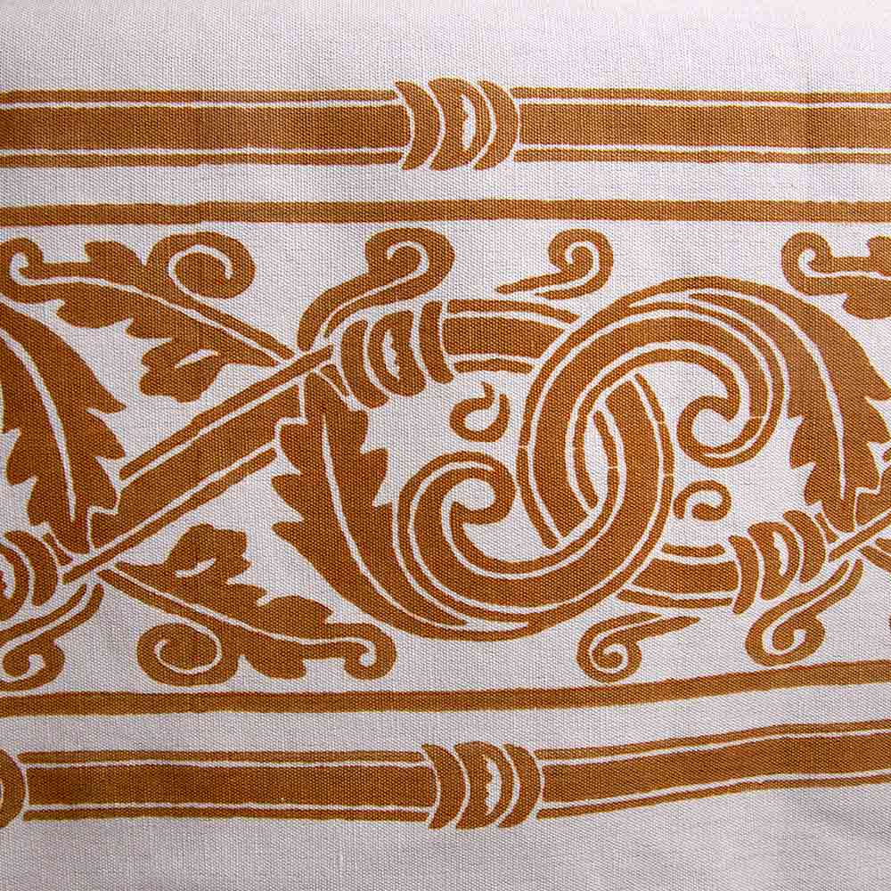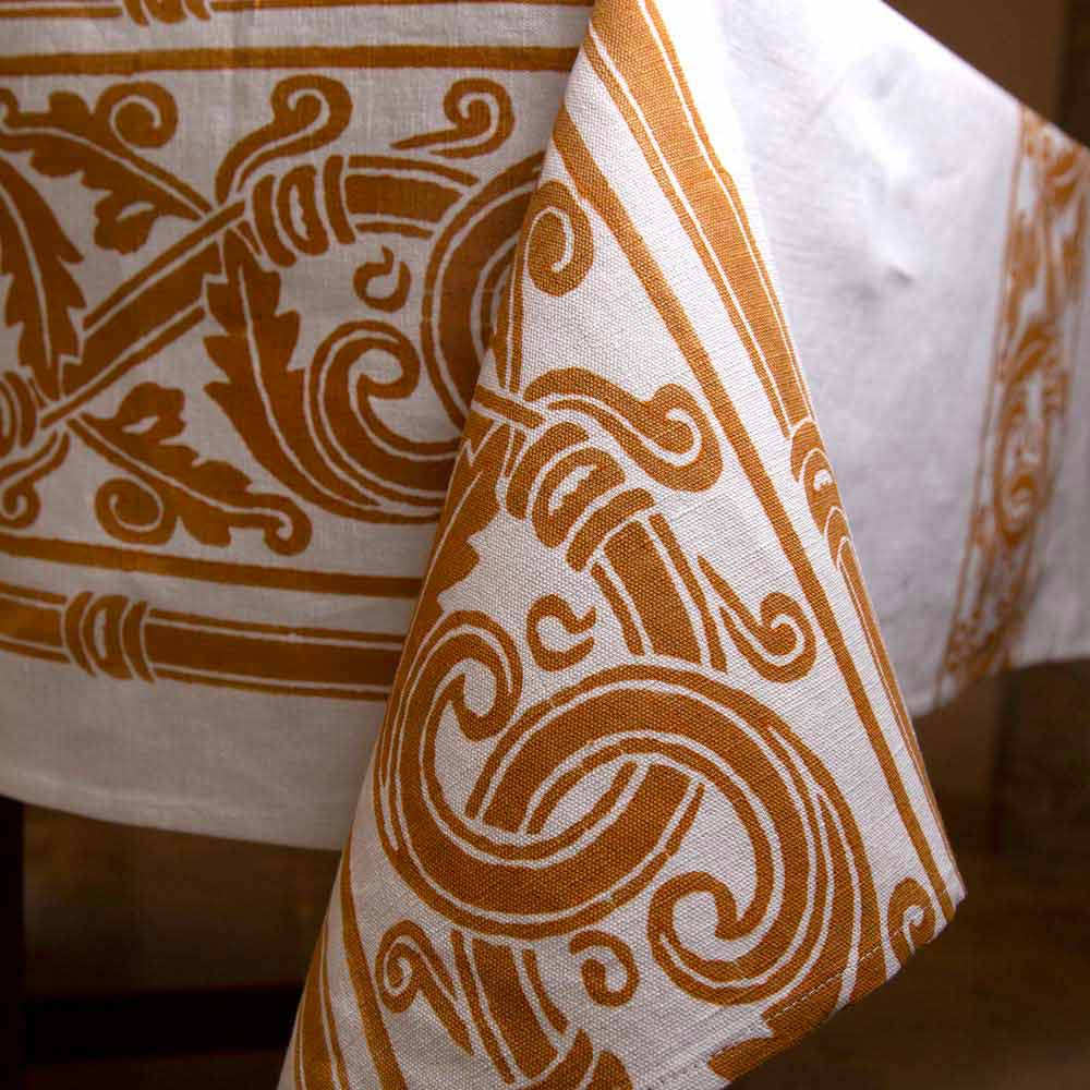 Vysoce vytvořený italský lněný a bavlněný ubrus vyrobený z jemného a uměleckého ručního tisku v rezové barvě podél okrajů a středu, ruční práce na exkluzivních starožitných látkách vyrobených v Itálii.