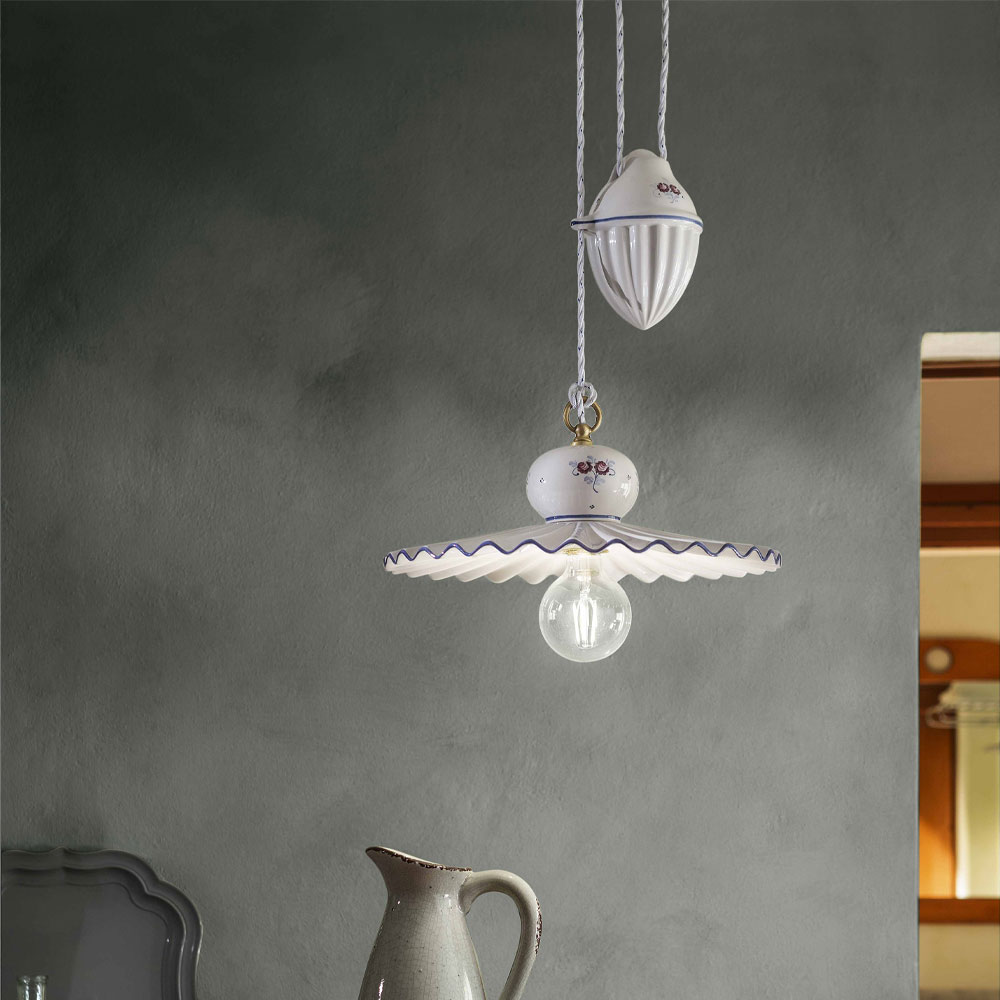 Ručně vyrobená závěsná posuvná lampa z kovu a ručně malované keramiky vyrobená v Itálii společností Ferroluce.