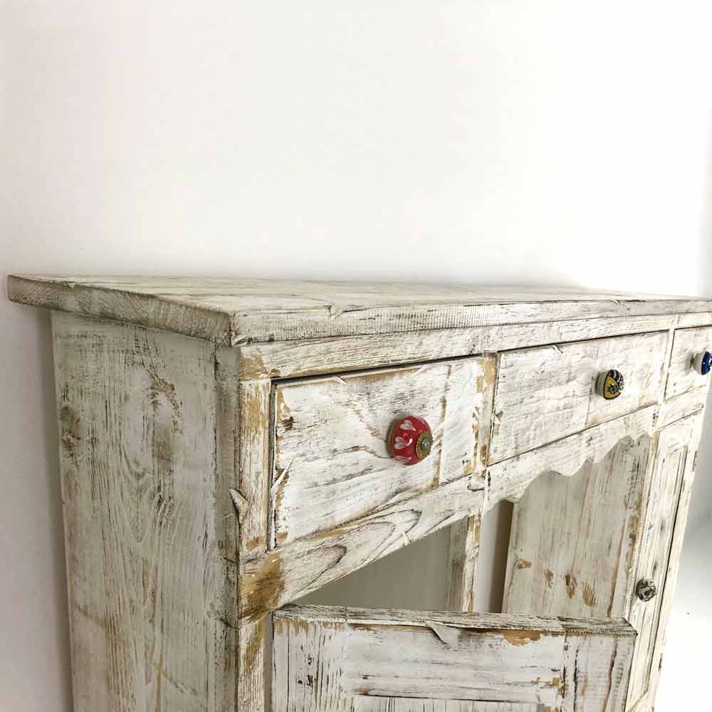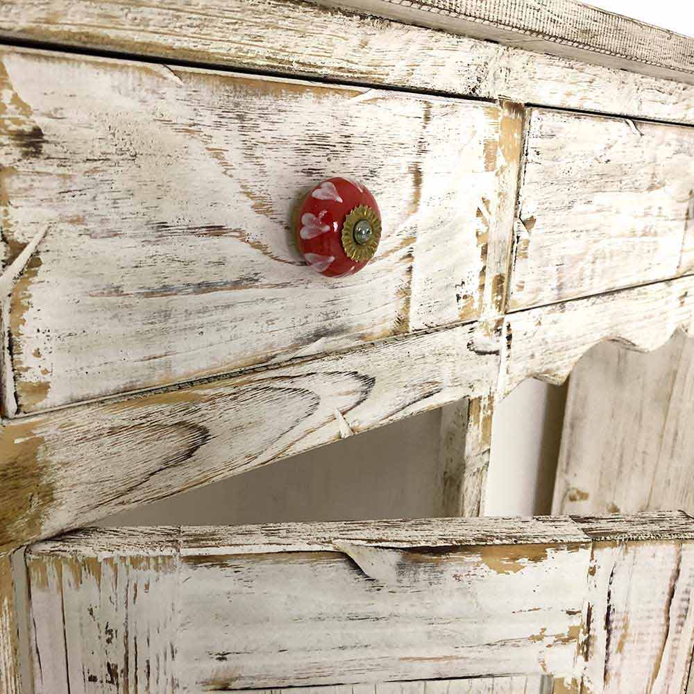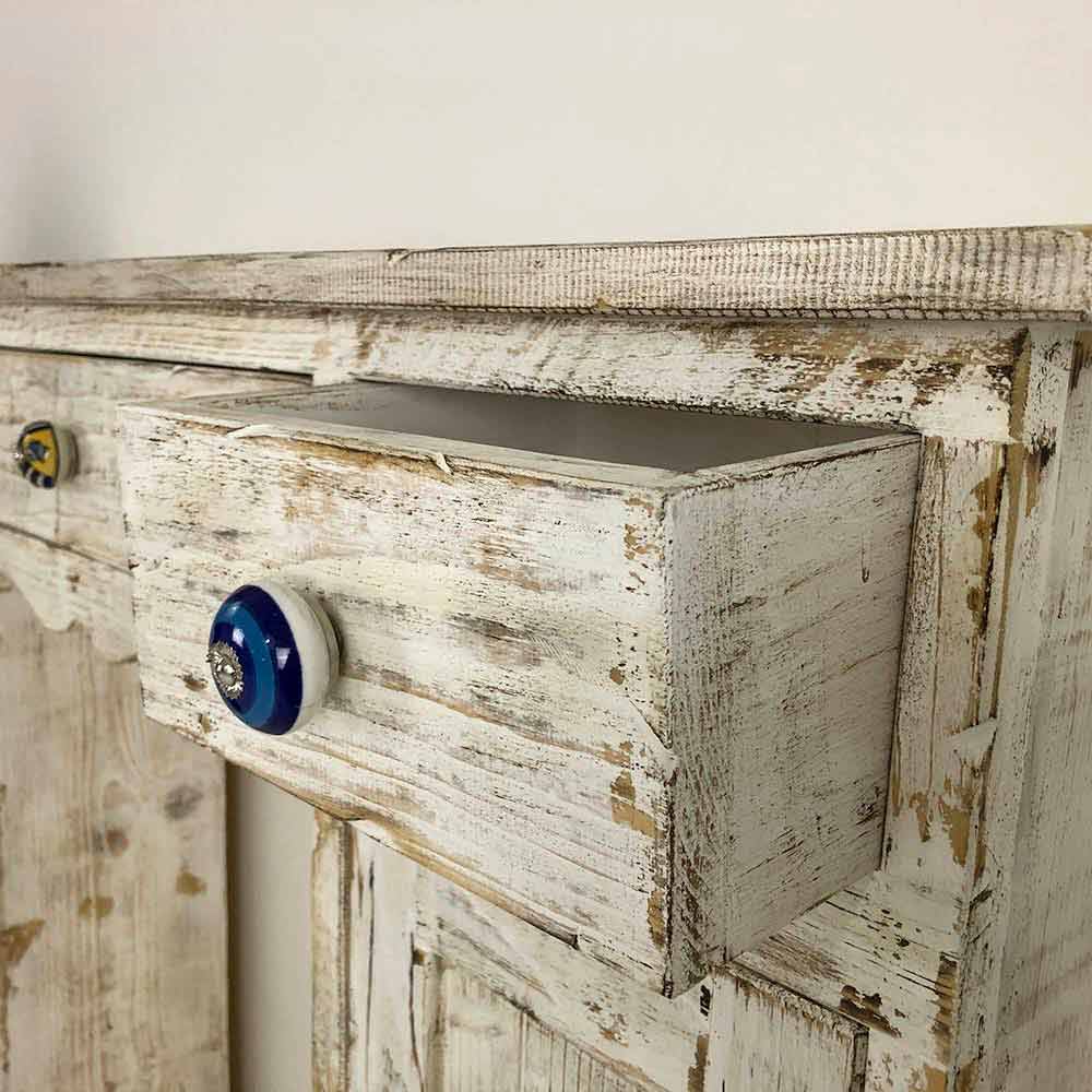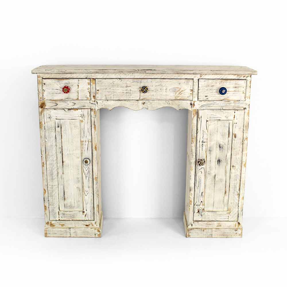 Konzole z masivního jedlového dřeva, zcela ručně vyrobená v Itálii a vyznačuje se nádherným plamenem a bíle zbarveným povrchem. Jeho struktura zahrnuje 2 dveře s vnitřní policí a 3 zásuvky, které jsou doplněny speciálními ručně malovanými keramickými knoflíky, které vám umožní mít dokonale uspořádané prostory.