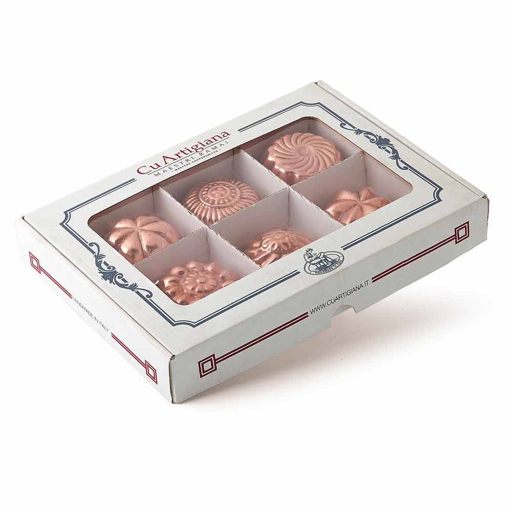 Ručně pocínované měděné dortové formy na různé ozdoby s mosazným kroužkem, 6 kusů italské výroby.