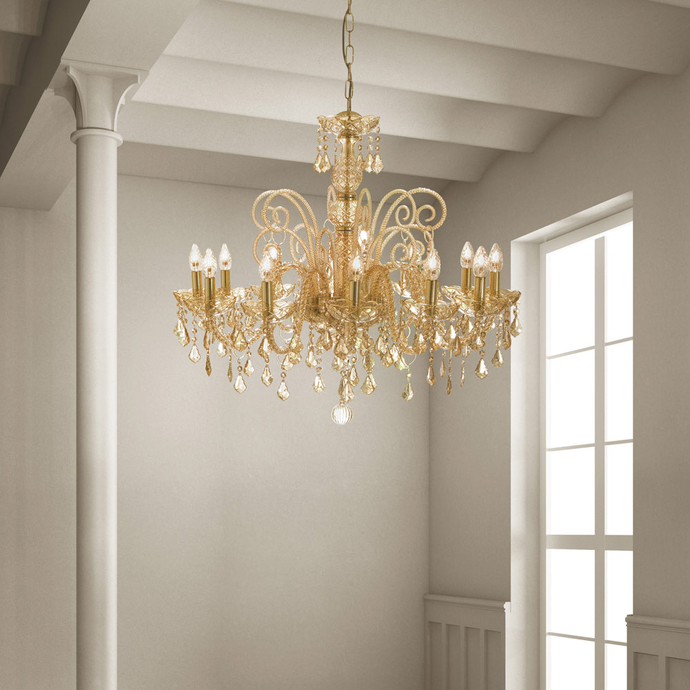 Lustr z benátského skla s dekorem Amber s národními přívěsky a leštěným chromovaným kovem . Tento doplněk, vyrobený řemeslnou zručností , se vyznačuje nádhernými pažemi zpracovanými ručně pomocí techniky kroucení, která vytváří exkluzivní výsledek, který esteticky připomíná propletení lana a dodává lustru osobitost. Skutečný déšť světla proniká do konstrukce lustru a poté se pomocí lomu šíří do okolního prostředí magií flitrů a křišťálových přívěsků s jemnými povrchovými úpravami, čímž vytváří evokující a snový scénografický efekt schopný okouzlit a překvapit. pro jeho eleganci a majestátnost .