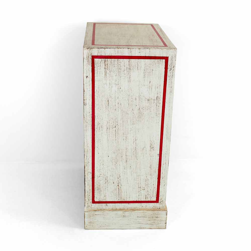 Komoda ručně vyrobená v Itálii se strukturou z masivního dřeva abet , ve věku bílá povrchová úprava a 6 zásuvek z topolové překližky s dřevěným čelním panelem namalovaným v diagonálním vzoru a detaily ve starožitném zlatě a červené barvě. Produkt je zakončen průhledným povrchem, který je vodoodpudivý a fixuje barvy tak, aby byly časem nezměnitelné.