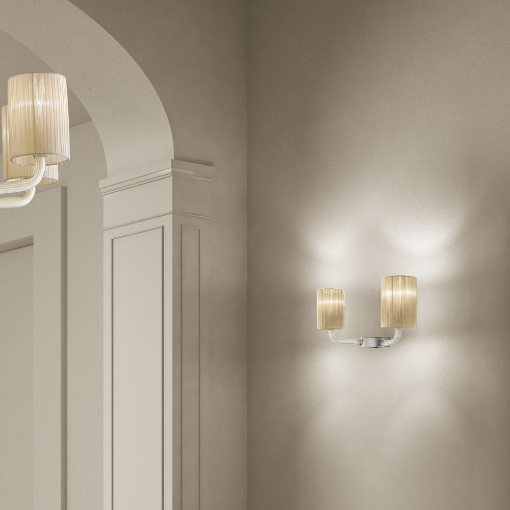 Nástěnná lampa z benátského skla s mléčnou bílou a slonovinovou povrchovou úpravou ručně s kovovými detaily v lesklém chromu a elegantními látkovými stínidly . Nábytek charakteristický členitým, ale zásadním designem , schopným obohatit prostředí a dát mu charakter díky silné jevištní přítomnosti typické pro klasické lustry minulosti. Trubková skleněná ramena jemným a elegantním způsobem podpírají nádherná látková stínidla, která pomáhají nést světlo všemi směry pro teplé , měkké a obklopující osvětlení.