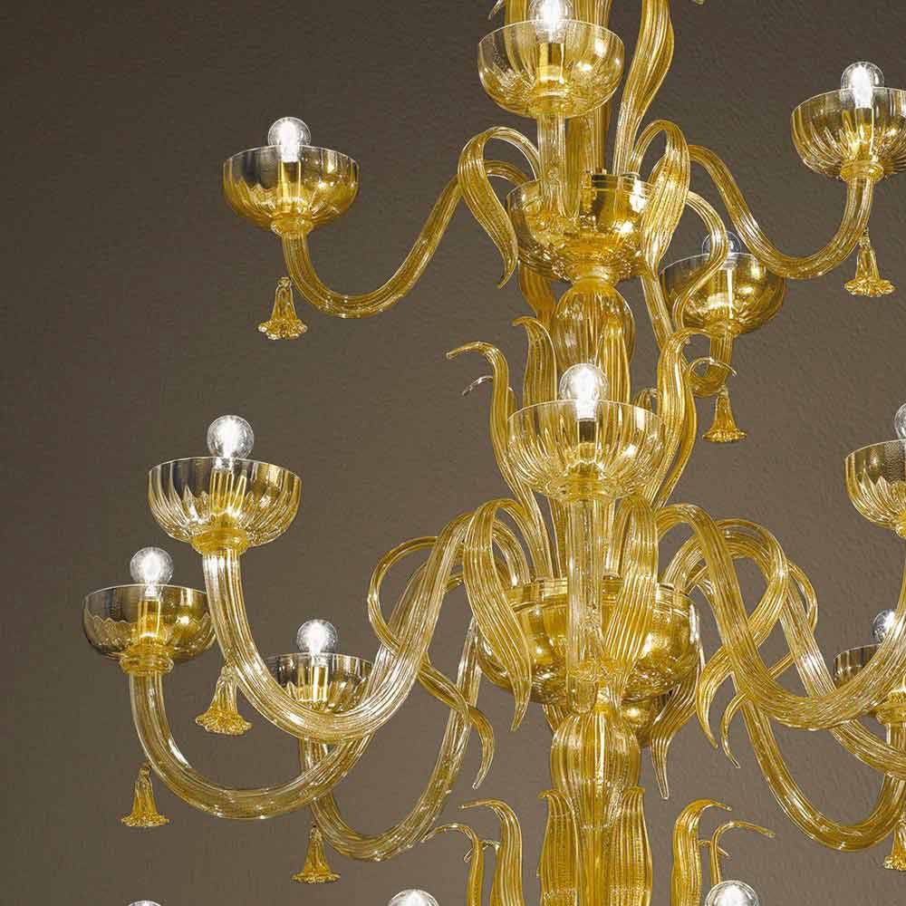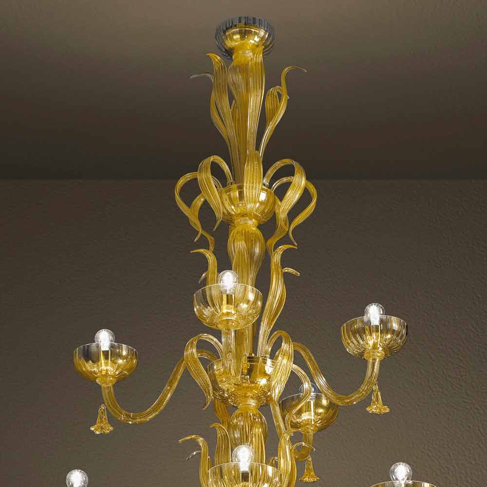 Impozantní a elegantní klasický lustr vyrobený v Itálii v Benátkách v ručně vyráběném skle pokrytém 24 karátovým zlatem nanášeným za tepla za horka a detaily v lesklém zlatém kovu . Tento úžasný kus nábytku pochází z použití starodávné techniky krytiny, jejíž estetika je založena na inovačních koncepcích a zároveň připomíná minulost . Spolu s majestátem zlata je design obohacen o zúžená ramena zdobená přívěskovými zvony, které jsou zcela ručně tvarovány pro výsledek vysoké kvality a neocenitelné hodnoty .