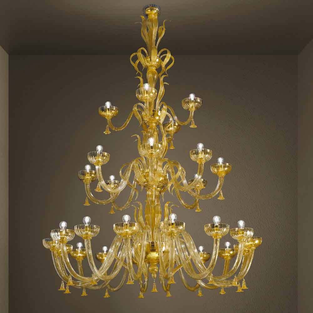 Ručně vyrobený lustr s 28 světly z benátského skla a 24k zlatem, vyrobený v Itálii.