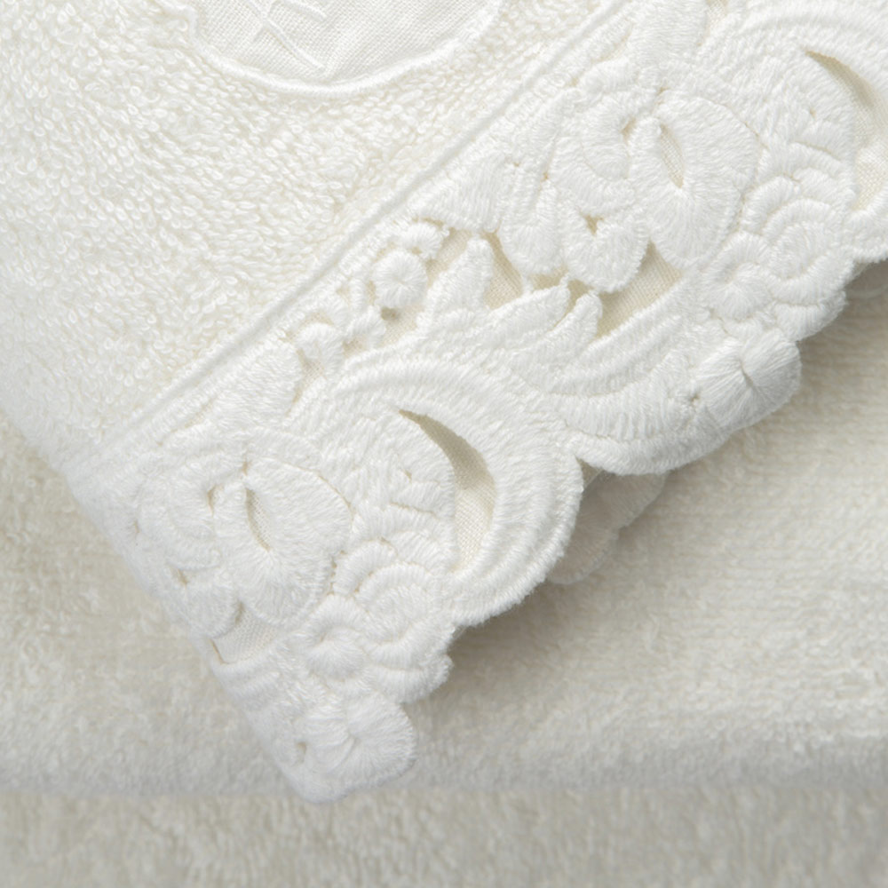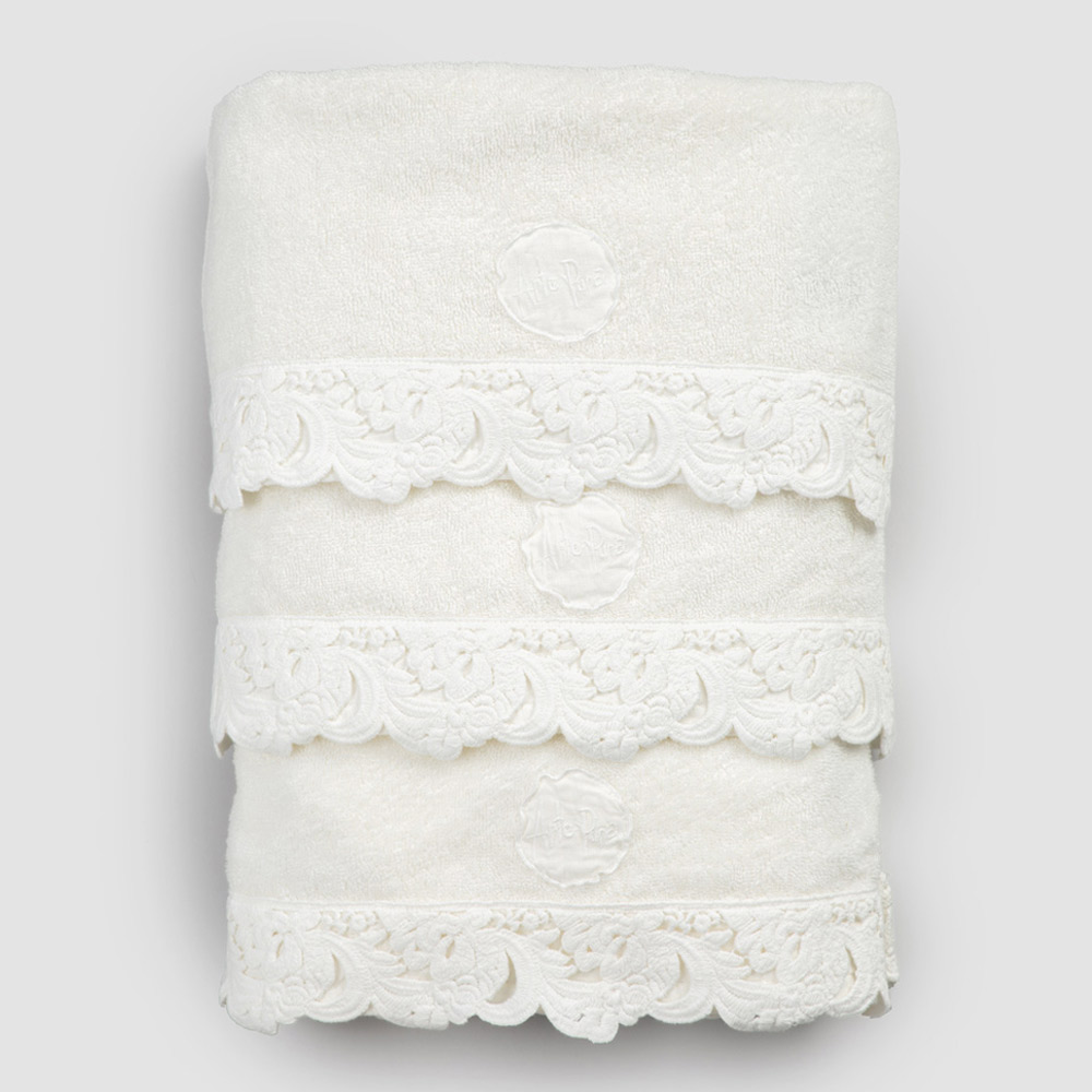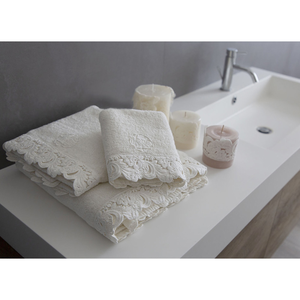 Služba ručníků na obličej a hosty a houbová osuška s krajkou, ručně vyrobený luxus vyrobený v Itálii.