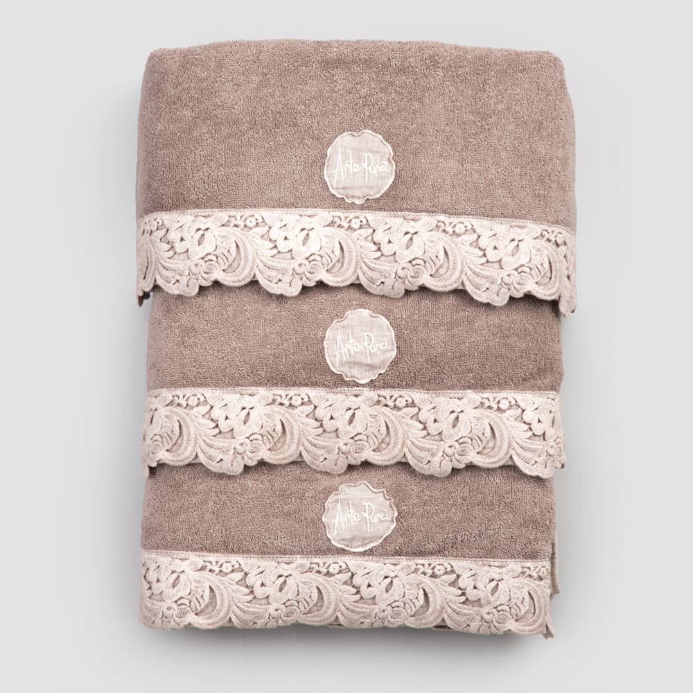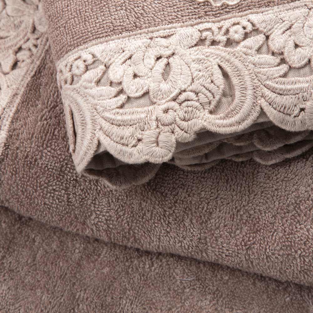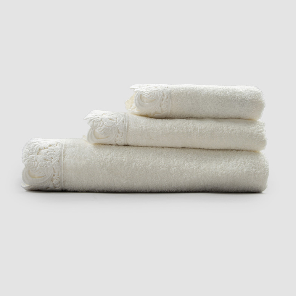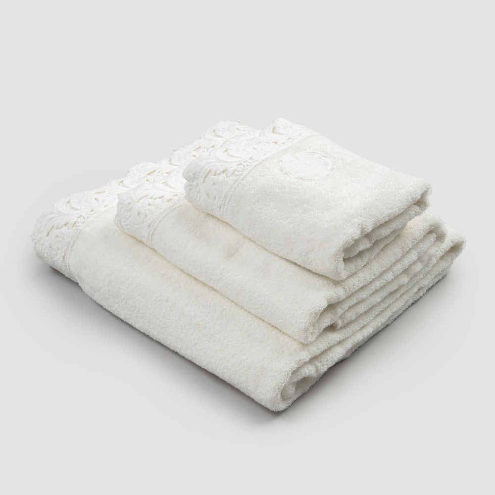 Služba ručníků na obličej a hosty a houbová osuška s krajkou, ručně vyrobený luxus vyrobený v Itálii.