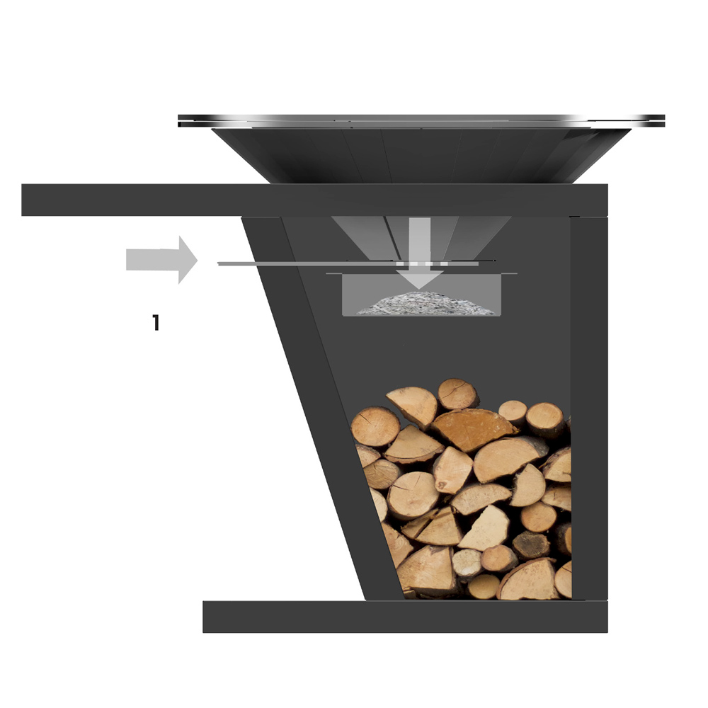 ocelová zásuvka pro sběr popela, se snadnou extrakcí, ve které popel spadne po stlačení páky pro nastavení ventilátoru a otevření všech větracích otvorů.
