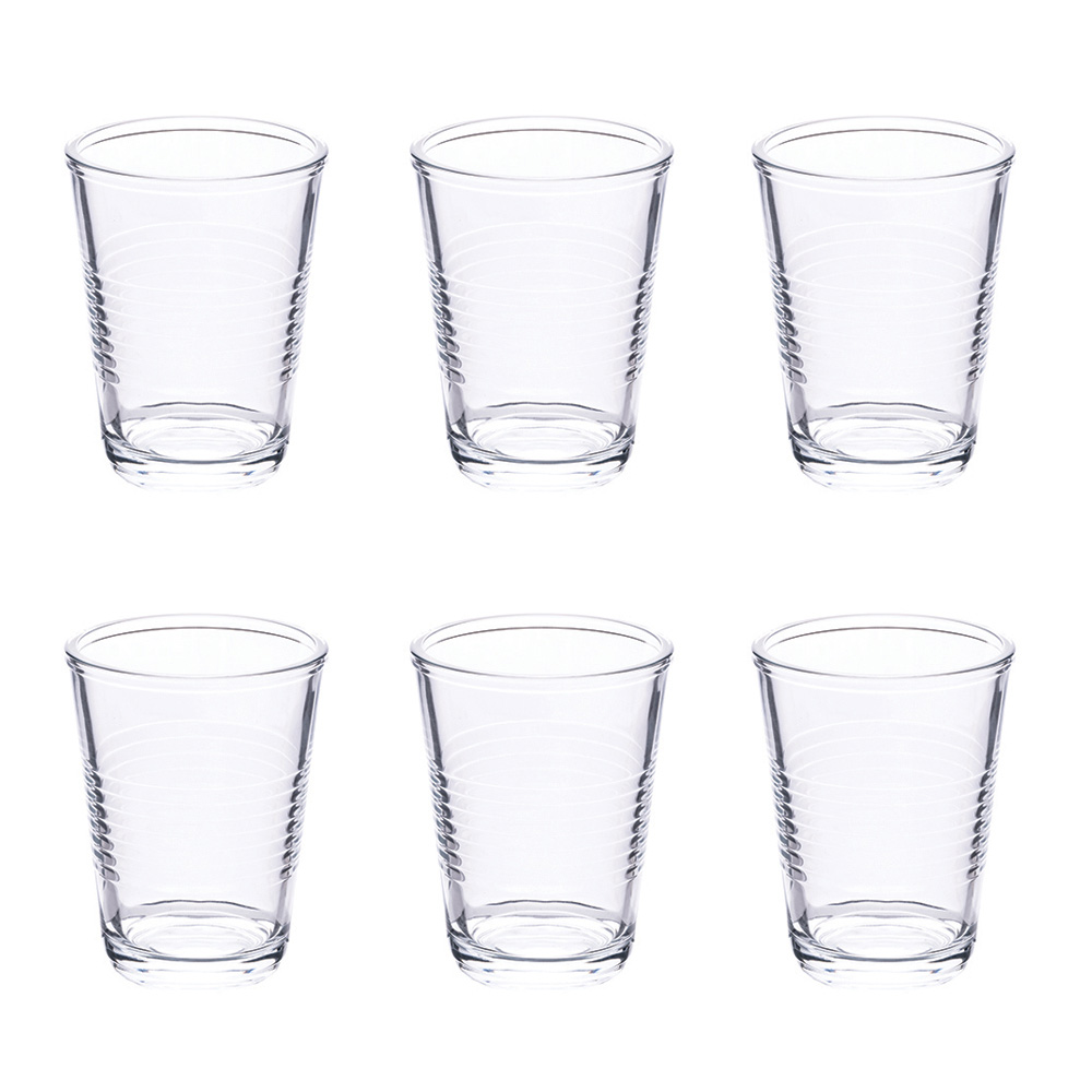 12 sklenic z průhledného skla s opracovaným povrchem.