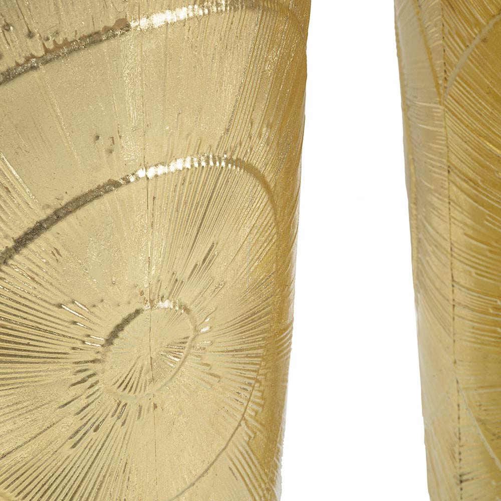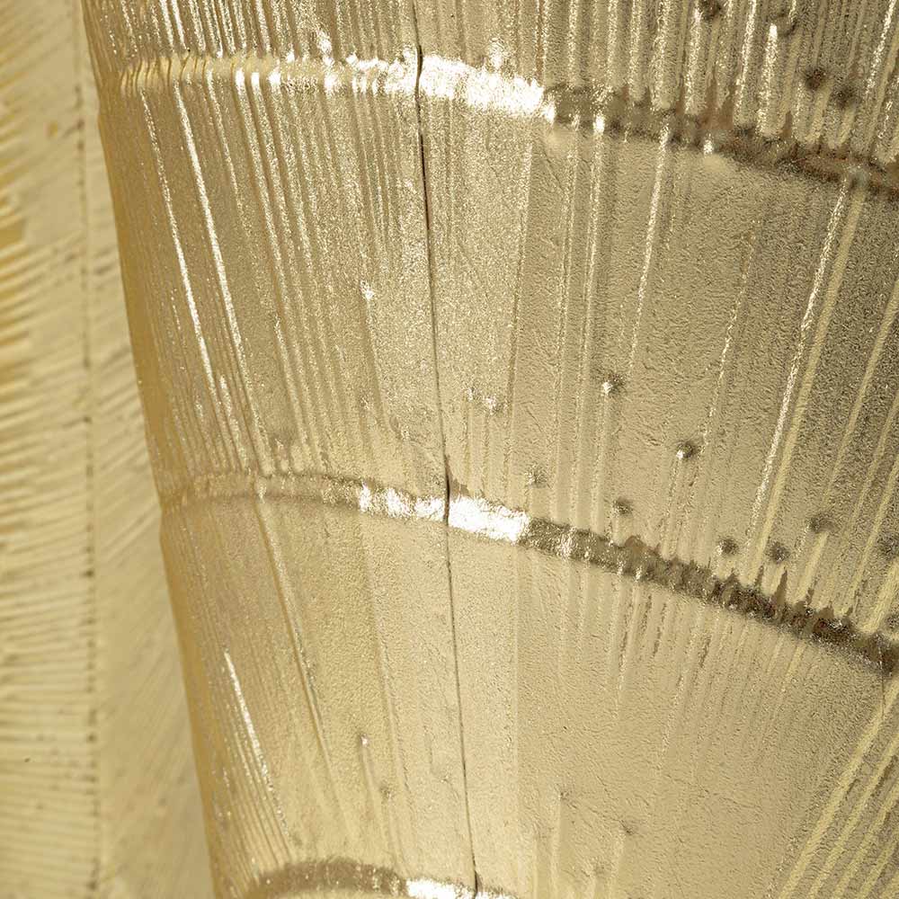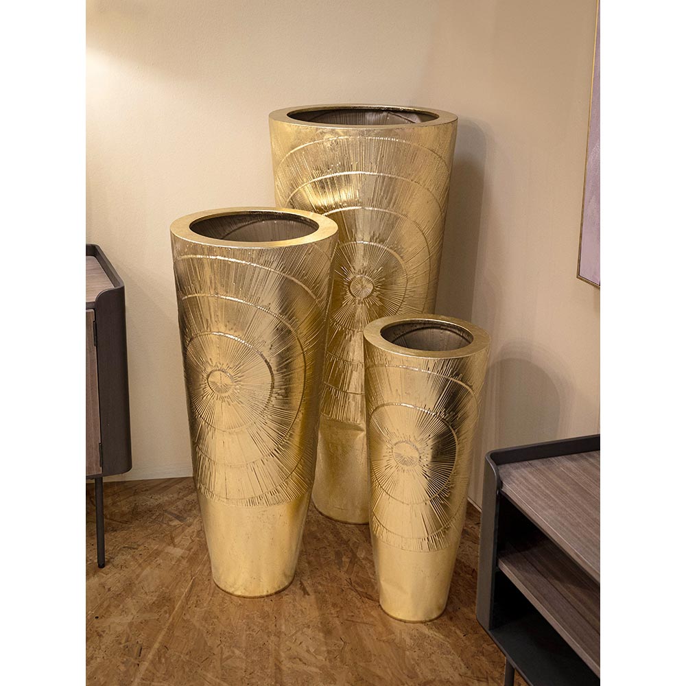 Tyto dekorativní vázy jsou skutečné sochy, umělecká díla, která upoutají pozornost a elegantně obohatí každé prostředí. Jejich zlatý tón vytváří hřejivý a přívětivý vizuální efekt, zatímco linie vyryté do žehličky vytvářejí zářivý efekt, který hladkému povrchu váz dodává pohyb a život.