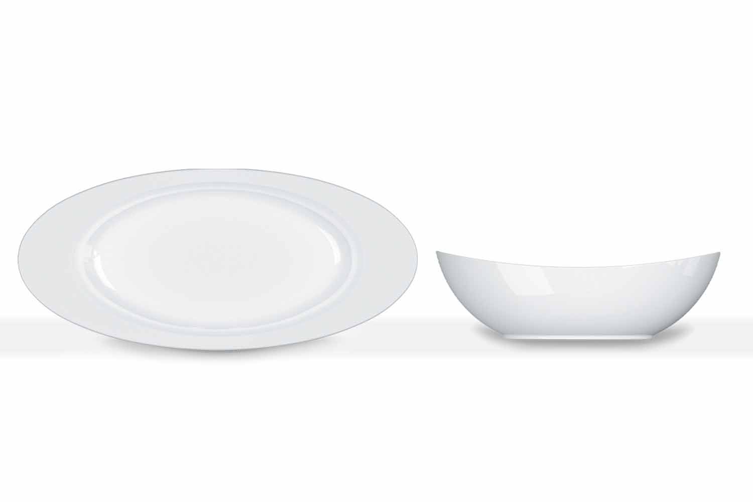 Servírovací sada moderního oválného designu v bílém porcelánu, 2 kusy.