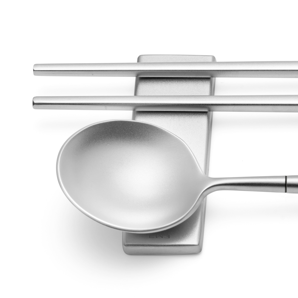 Dlouhé, štíhlé hůlky jsou navrženy pro pohodlné používání a bezpečné uchopení, zatímco lžíce má optimální hloubku pro snadné popíjení vývarů a omáček. Výrazným prvkem je čtvercová základna, která slouží jako odkládací plocha pro příbory a zajišťuje, že zůstanou čisté a dobře prezentované, když se nepoužívají.