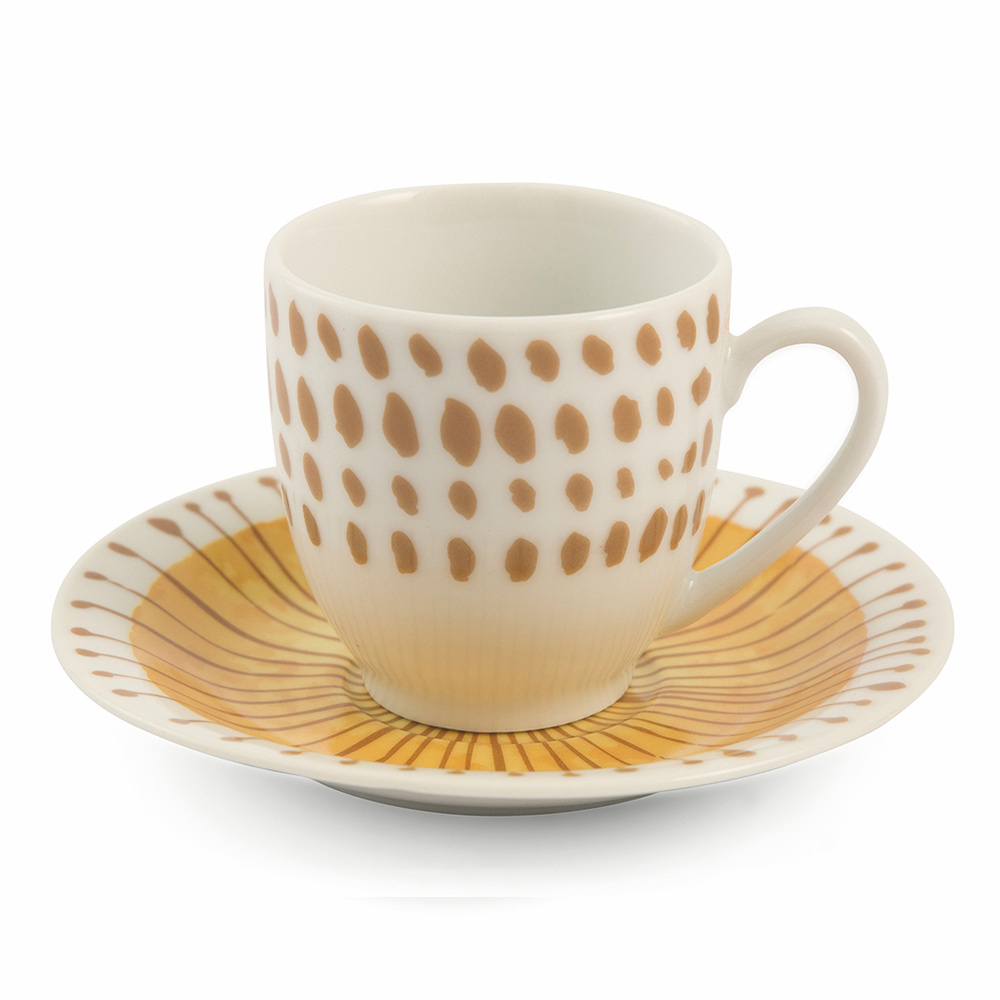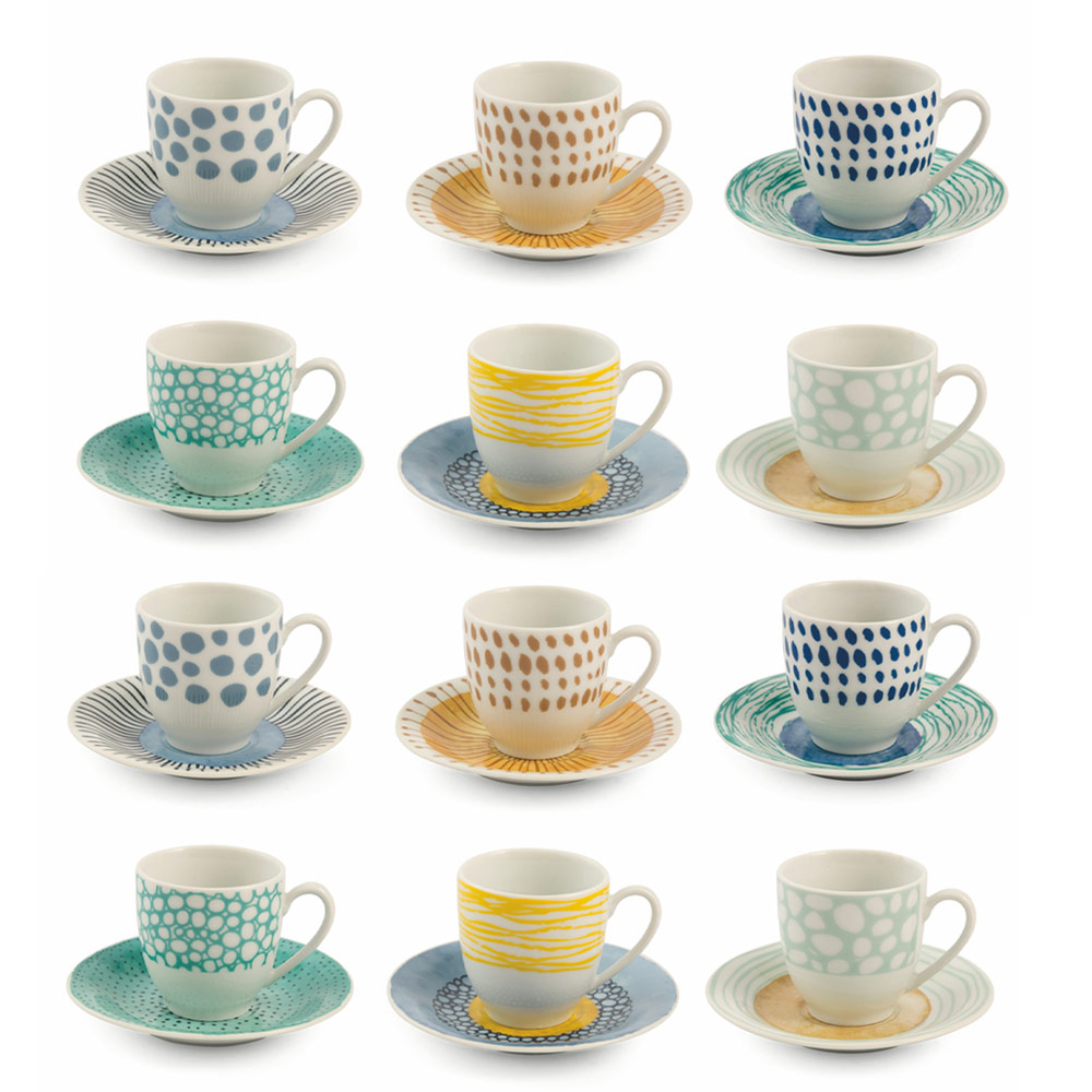 Sada šálků na kávu z barevného porcelánu s dekoracemi a podšálky, 12 kusů.