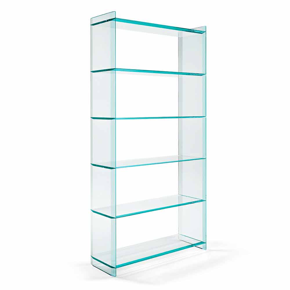 Tato knihovna v obývacím pokoji se vyznačuje svým zajímavým a elegantním designem, který je zcela vyroben z extra čirého skla se zkosením 5 cm.