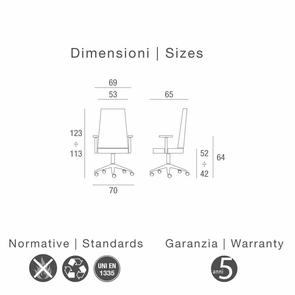Ada je vybaven vysoce zádech, područky z leštěného hliníku, kompletní s polstrovaným horní a s plochou základny 5 paprsky také z leštěného hliníku, kompletní s brzděnými kolečky o 50 mm.