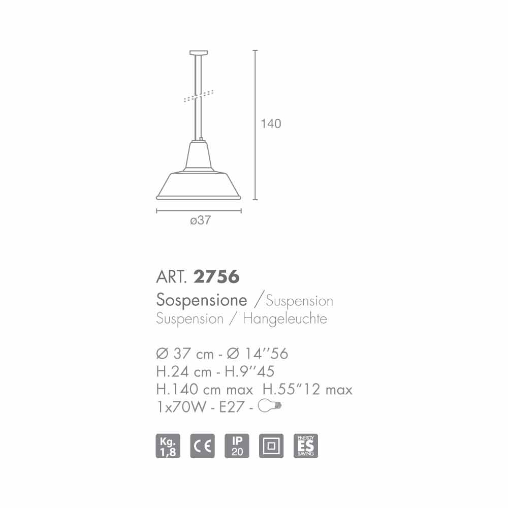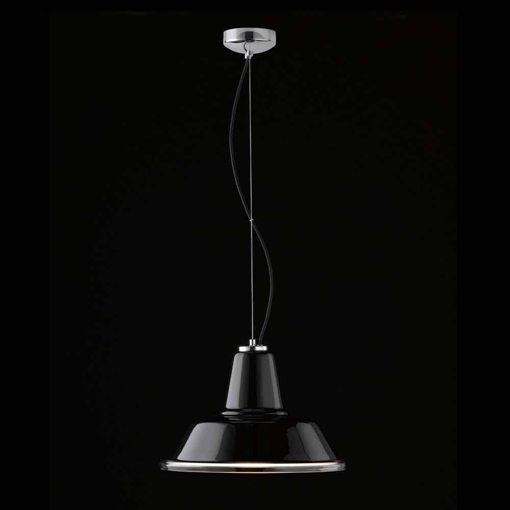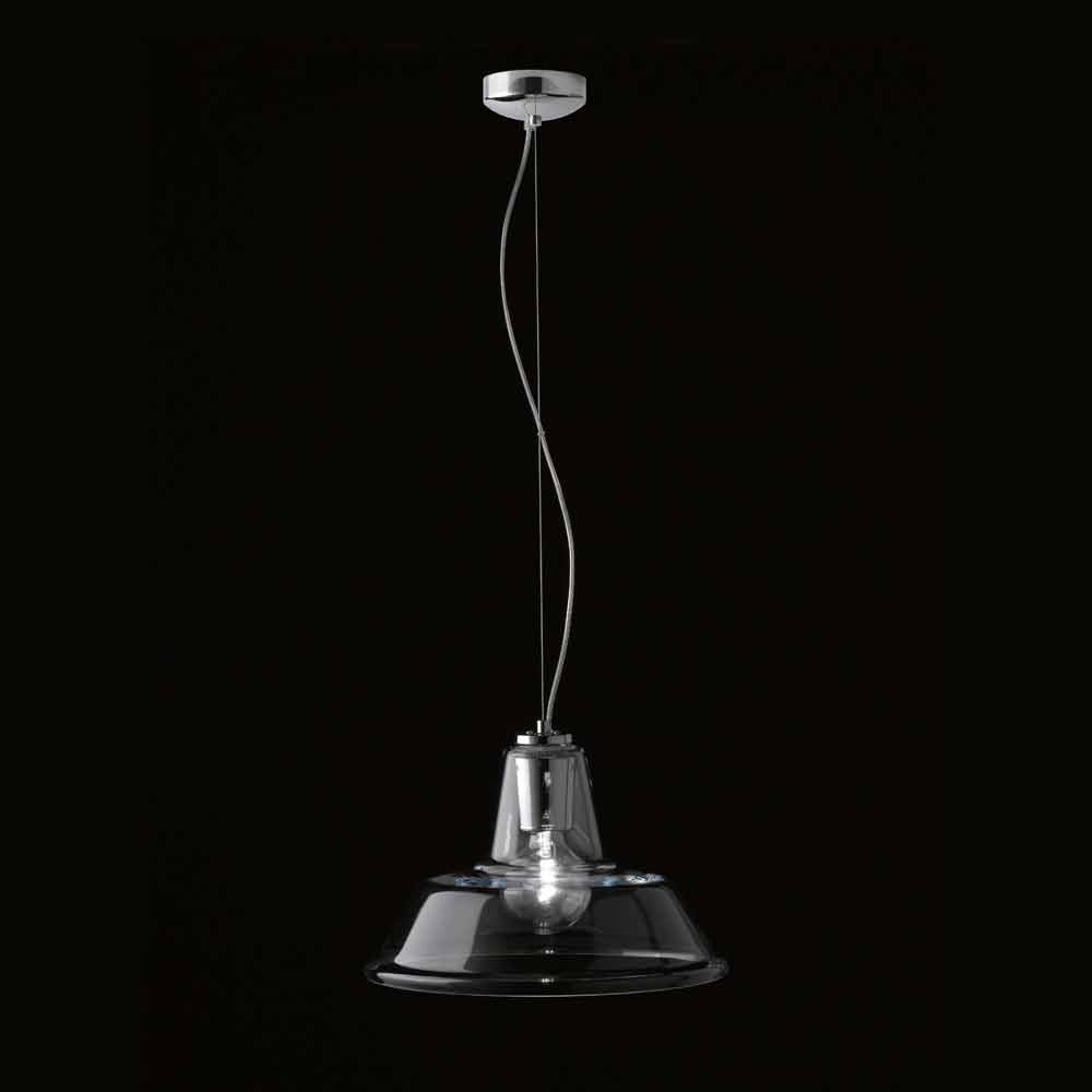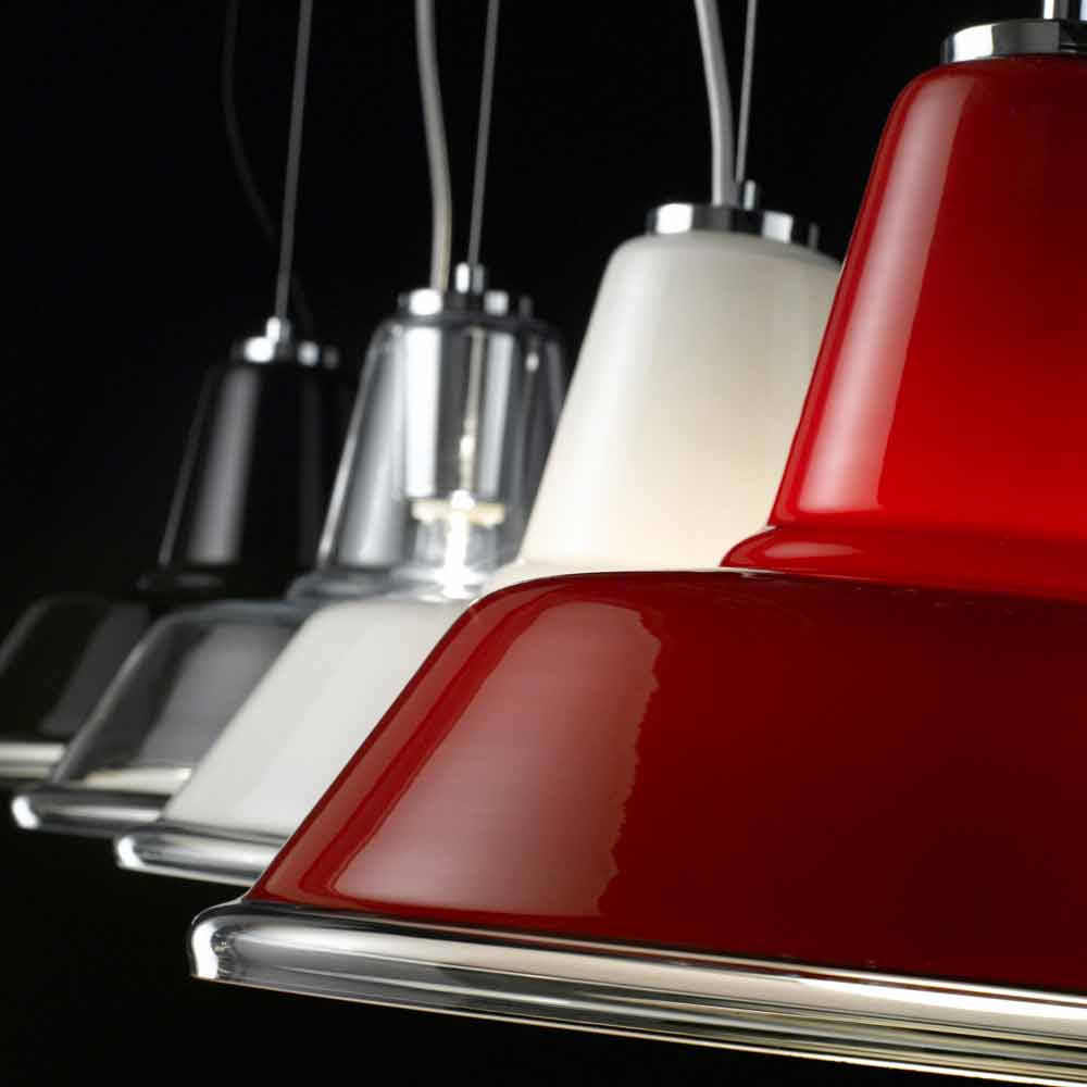 Lampara závěsné svítidlo z riconoscibie průmyslového vzoru, vytvořený speciálním stínítko z foukaného skla. Dostupné úpravy jsou: transparentní, bílé, černé nebo červené, s chromovou rámu. E ‚určený pro‘ užití jedné žárovky 70W E27.