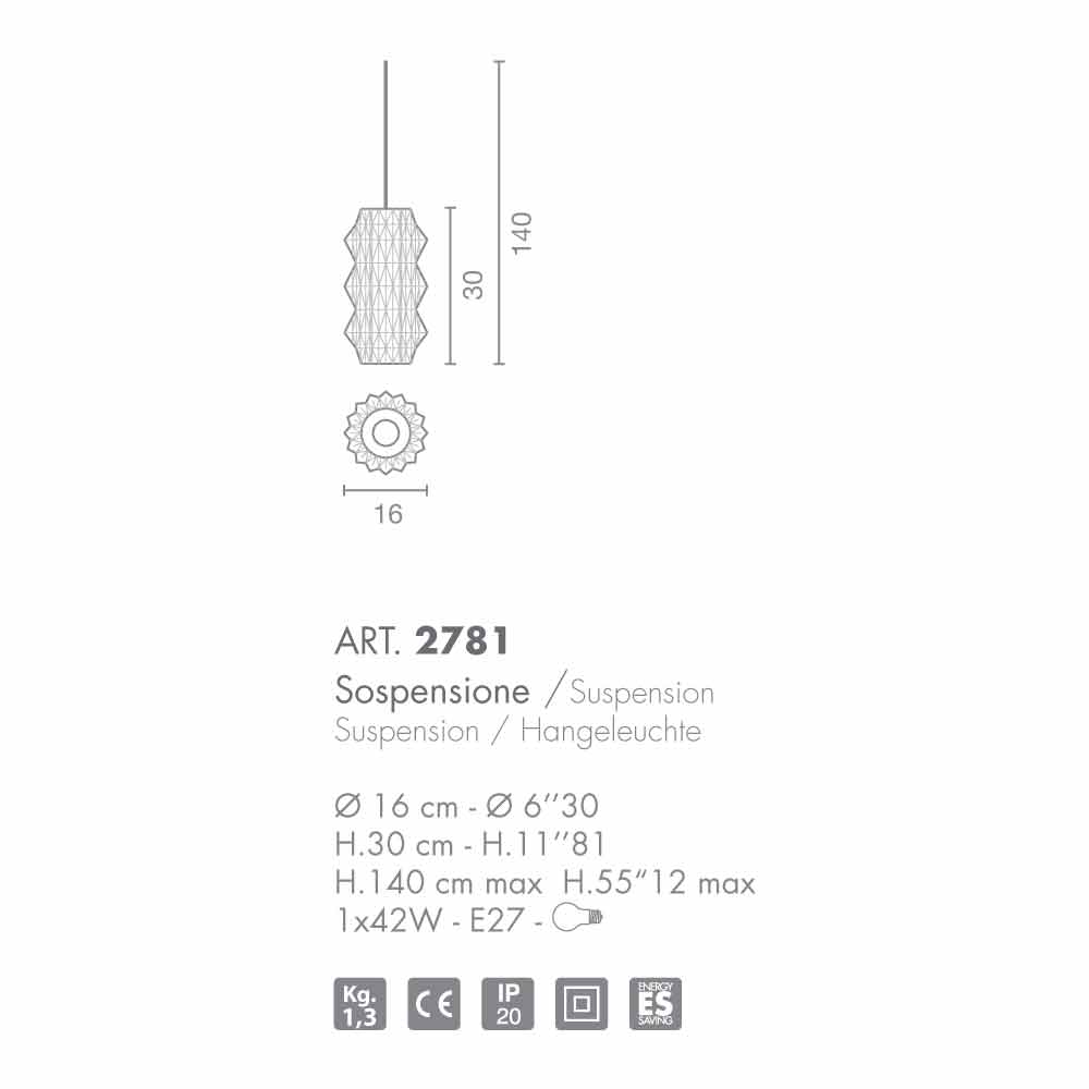 Origami je rozdělen do zavěšeného lampou a stolkem, obojí k dispozici v různých barvách. Kolekce, která vyplývá z provedení secese a jeho elegantní linie a stylizované do formy k vytvoření foukané sklo podobný ‚umělecké dílo. Tato lampa je určena pro ‚užití 1 žárovka 42W - E27.