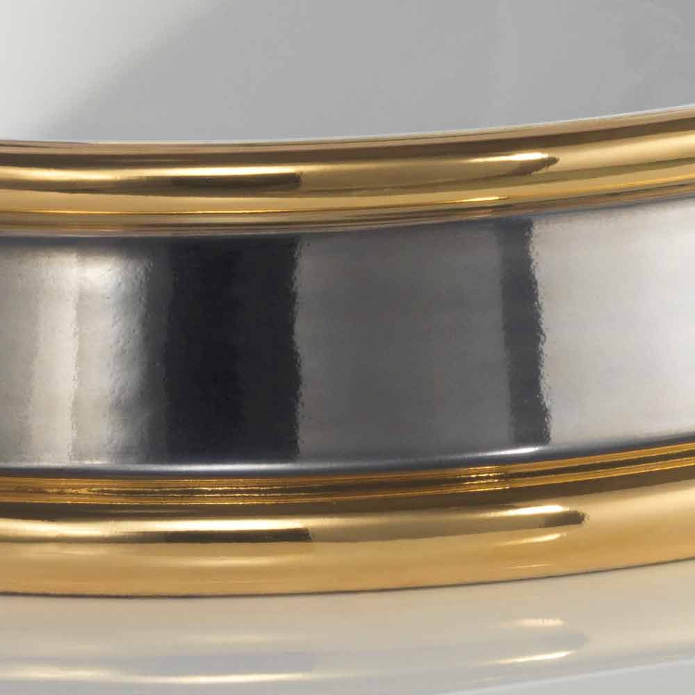 Pohodlné koupelnové umyvadlo vyrobené v Itálii v požární hlíně, ručně vyráběné, s proužkem ručně malovaným v platině a kroužky ručně malované 24k zlatým povrchem.