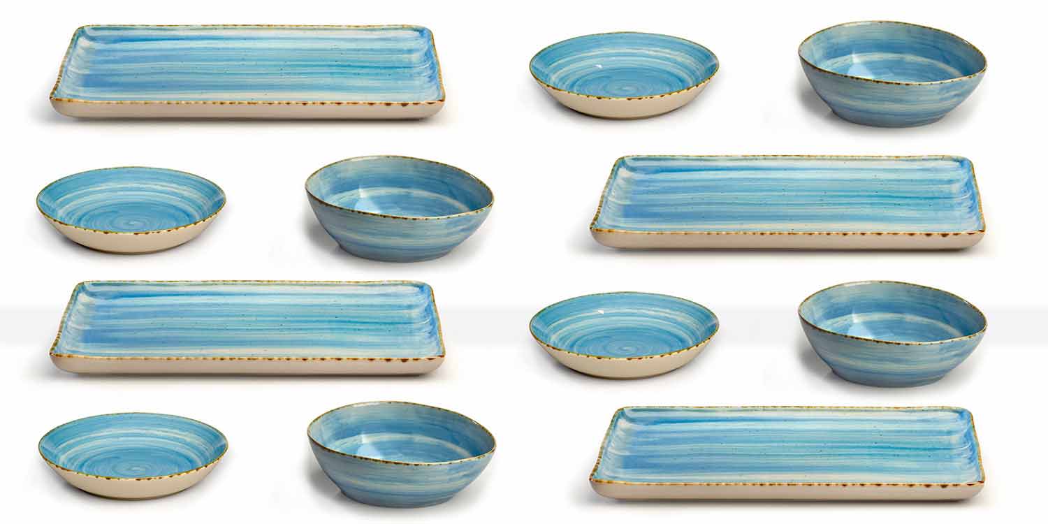 Servis 12 moderních obdélníkových a kulatých barevných kameninových desek s elegantním a originálním designem.