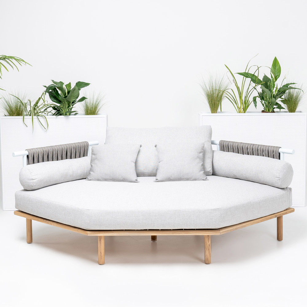 Šestihranná zahradní rohová sedačka z teakového dřeva, hliníkovými opěradly a výpletem z Olefin/PP ROPE a polštářem