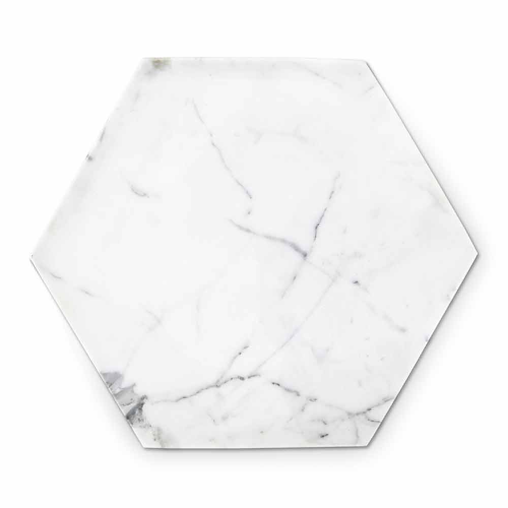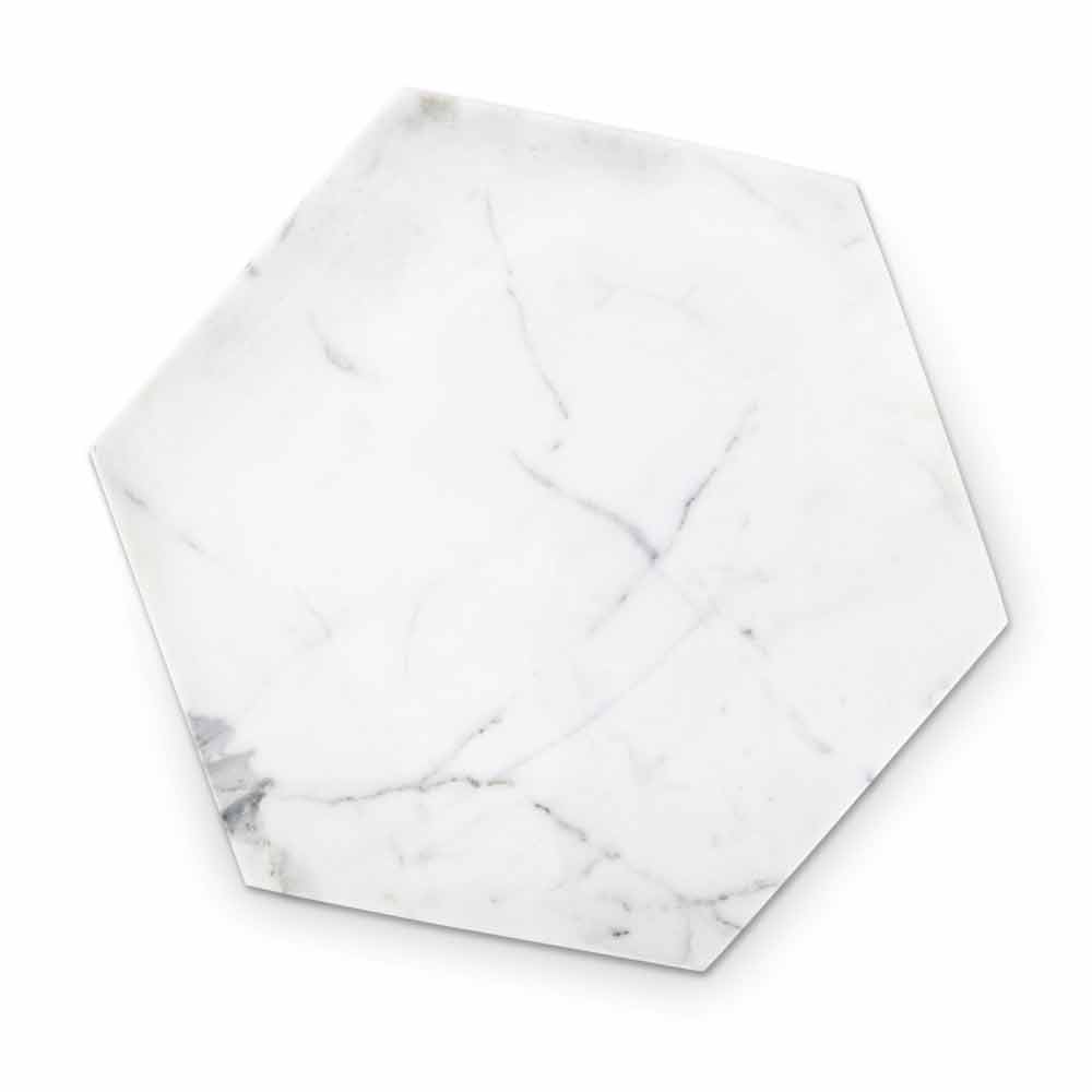 Šestihranný designový talíř z bílého mramoru Carrara Made in Italy.