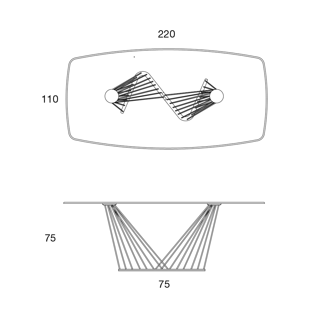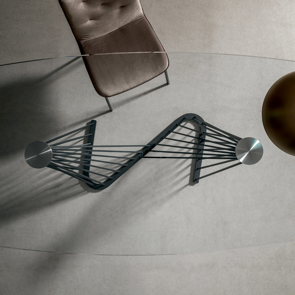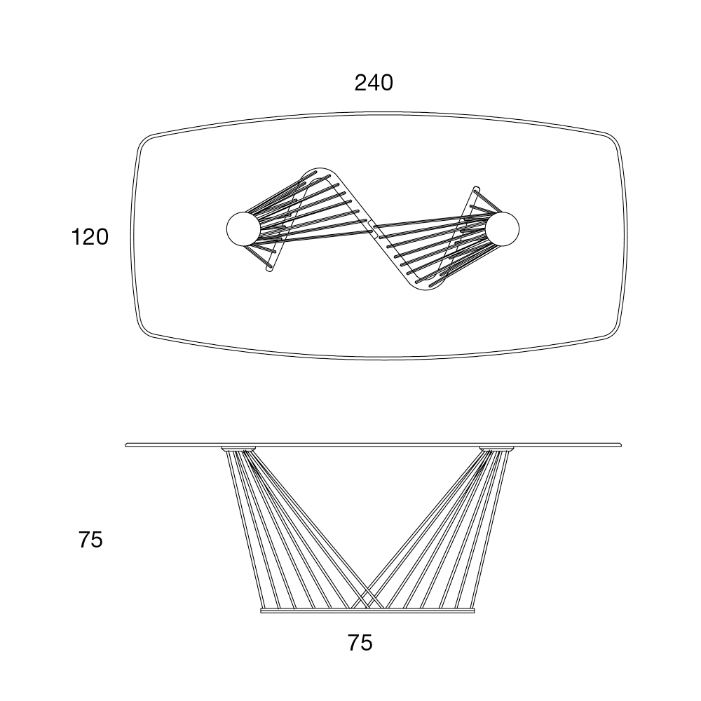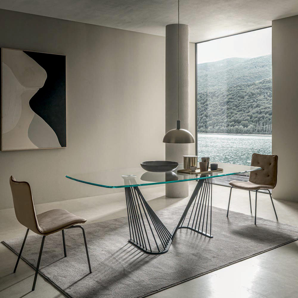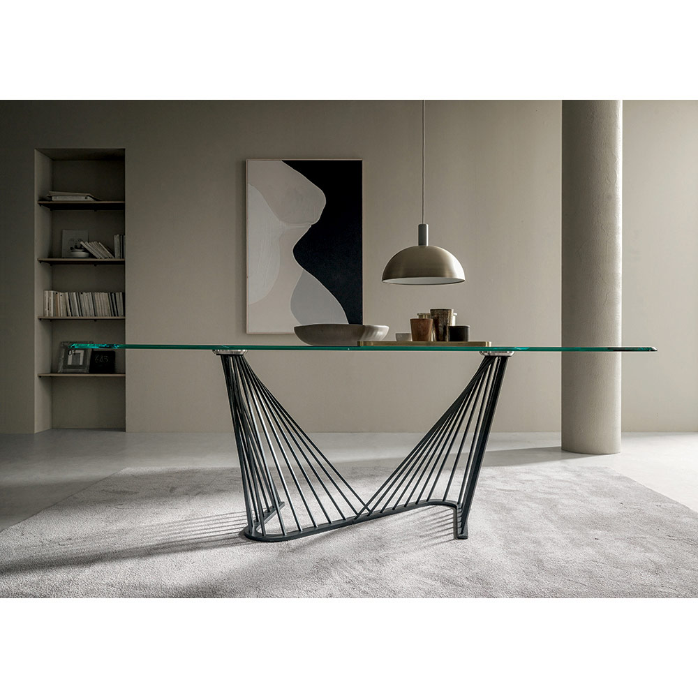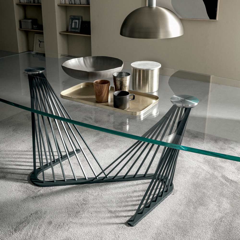 Jídelní stůl z průhledného skla a podnoží s kovovými lanky, 2 velikosti vyrobené v Itálii.