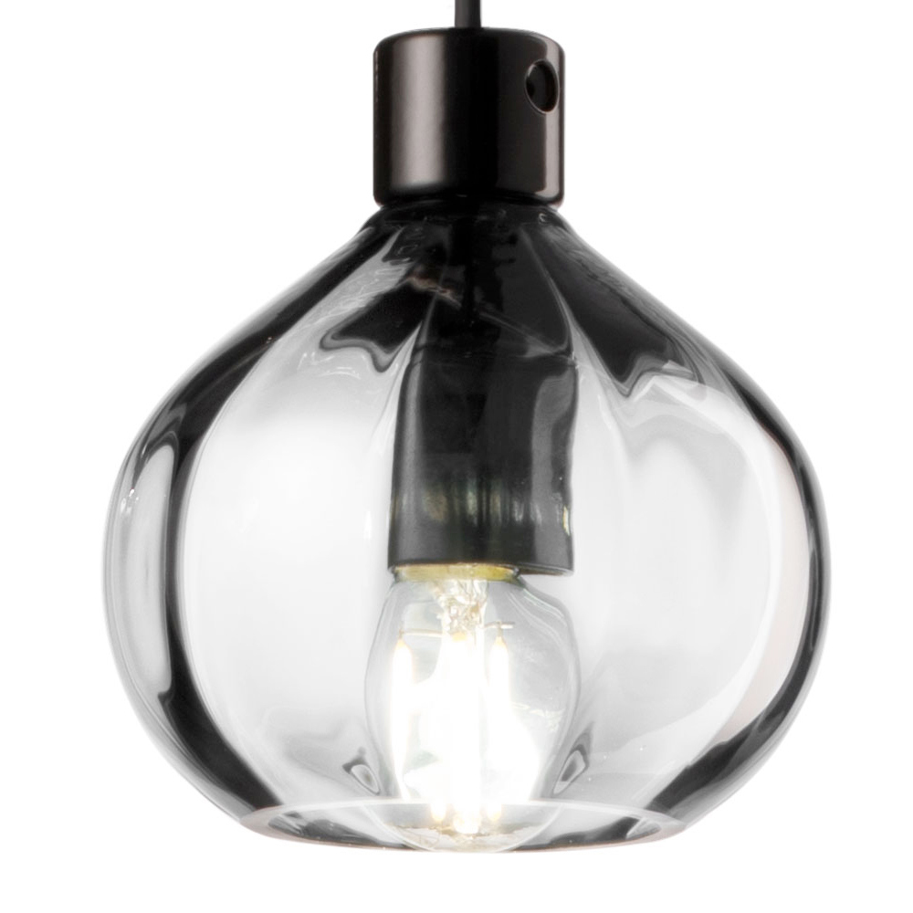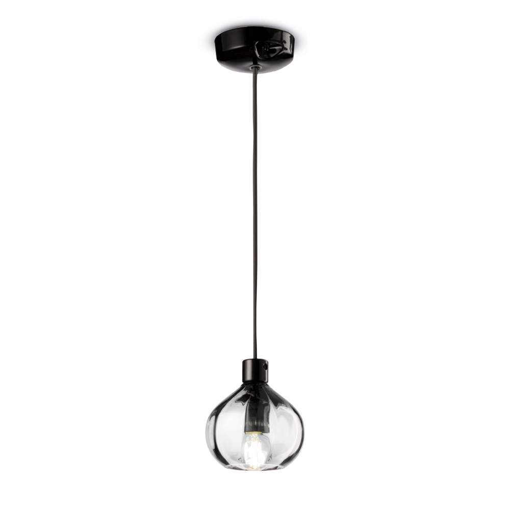 Tato závěsná lampa je esencí transparentnosti s nádechem modernosti. Sklo se svou čistou a nadčasovou povahou je zde tvarováno do koule, která zachycuje a odráží světlo a vytváří hru jasů a stínů, která dodává prostředí dynamiku. Jantarová verze se svým teplým a příjemným odstínem je ideální pro vytvoření intimní a uvolněné atmosféry. Transparentní varianta však vydává krystalické světlo, ideální pro osvětlení s nádechem minimalistické třídy.