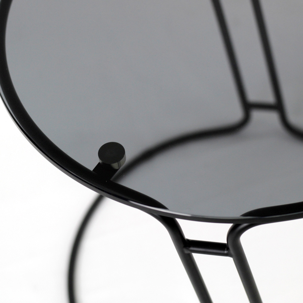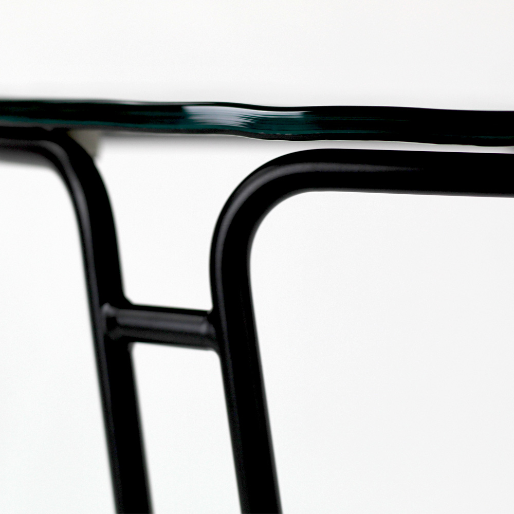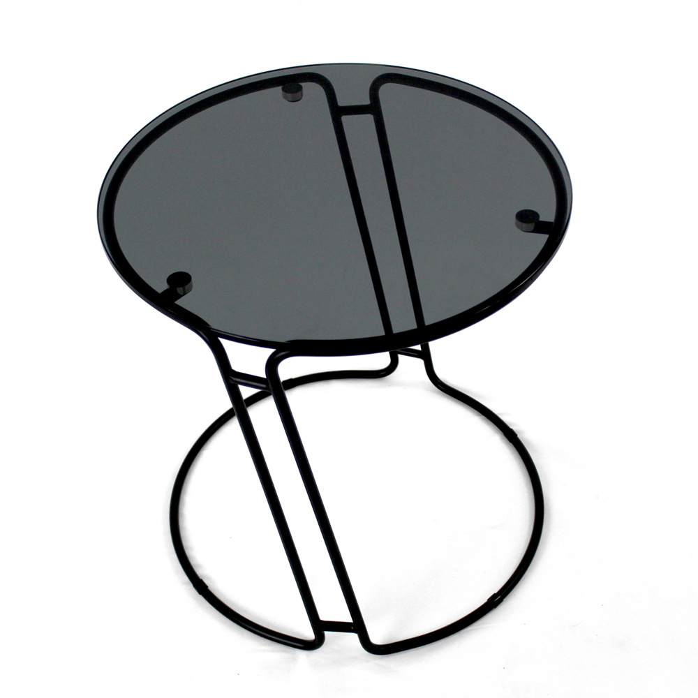 Kulatý konferenční stolek s lakovanou ocelovou základnou a skleněná deska.