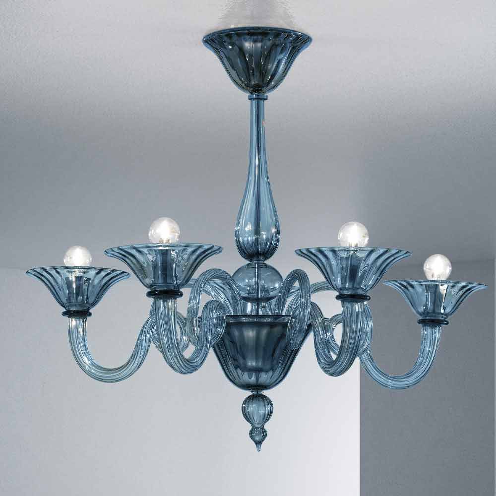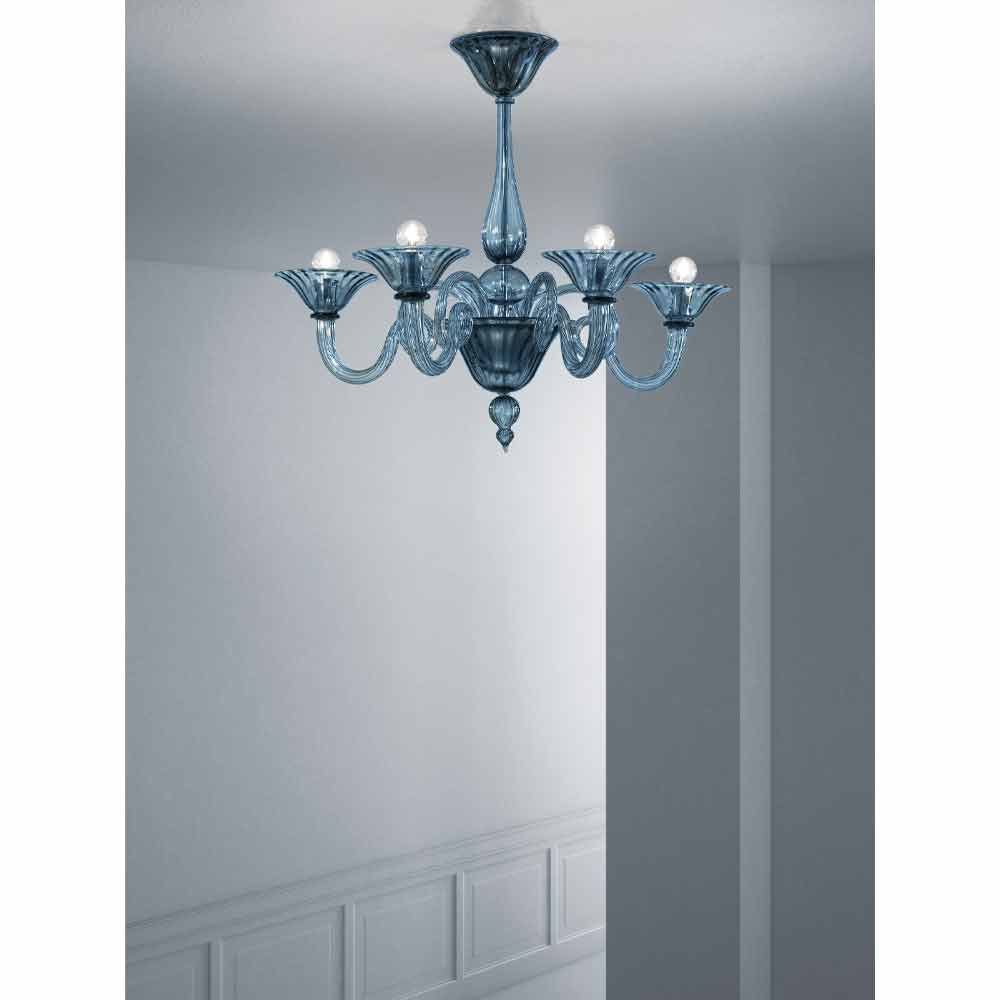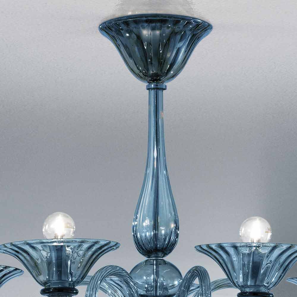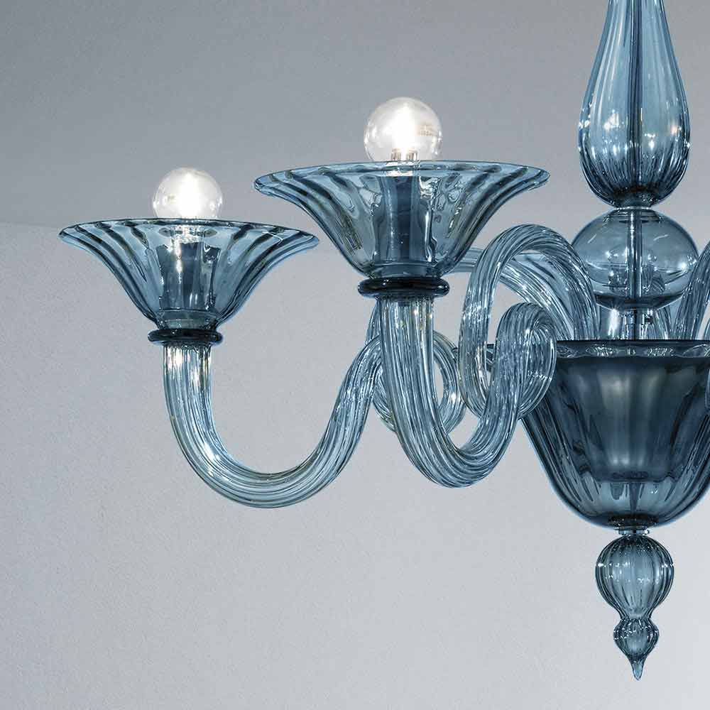 Excentrický a barevný lustr s klasickými linkami ručně vyráběnými v Itálii v Benátkách v barvě modrého skla a kovu s leštěným chromovaným povrchem . Vyváženost a symetrie jsou hlavními rysy tohoto nádherného bytového doplňku s tradičními prvky, které je obohaceno o moderní nádech daný modrou barvou, díky čemuž je také ideální pro osvětlení domácího prostředí současným nábytkem a vytváří nádherné hry kontrastů pro originální a avantgardní výsledek . Design je obohacen o bezprecedentní tvar ramen modelovaných během zpracování foukaného skla pro kreativní a fascinující efekt .