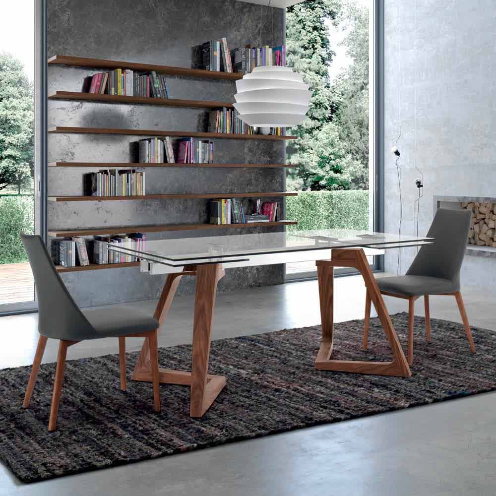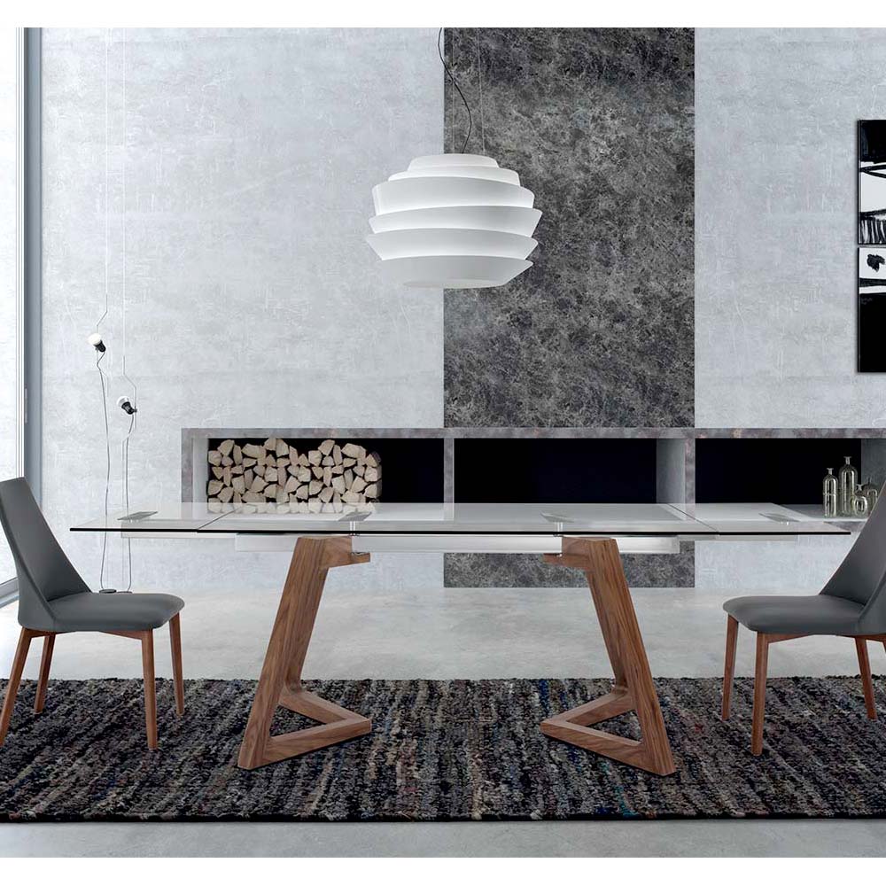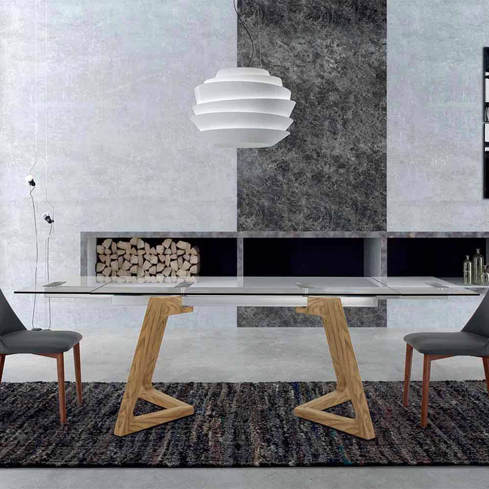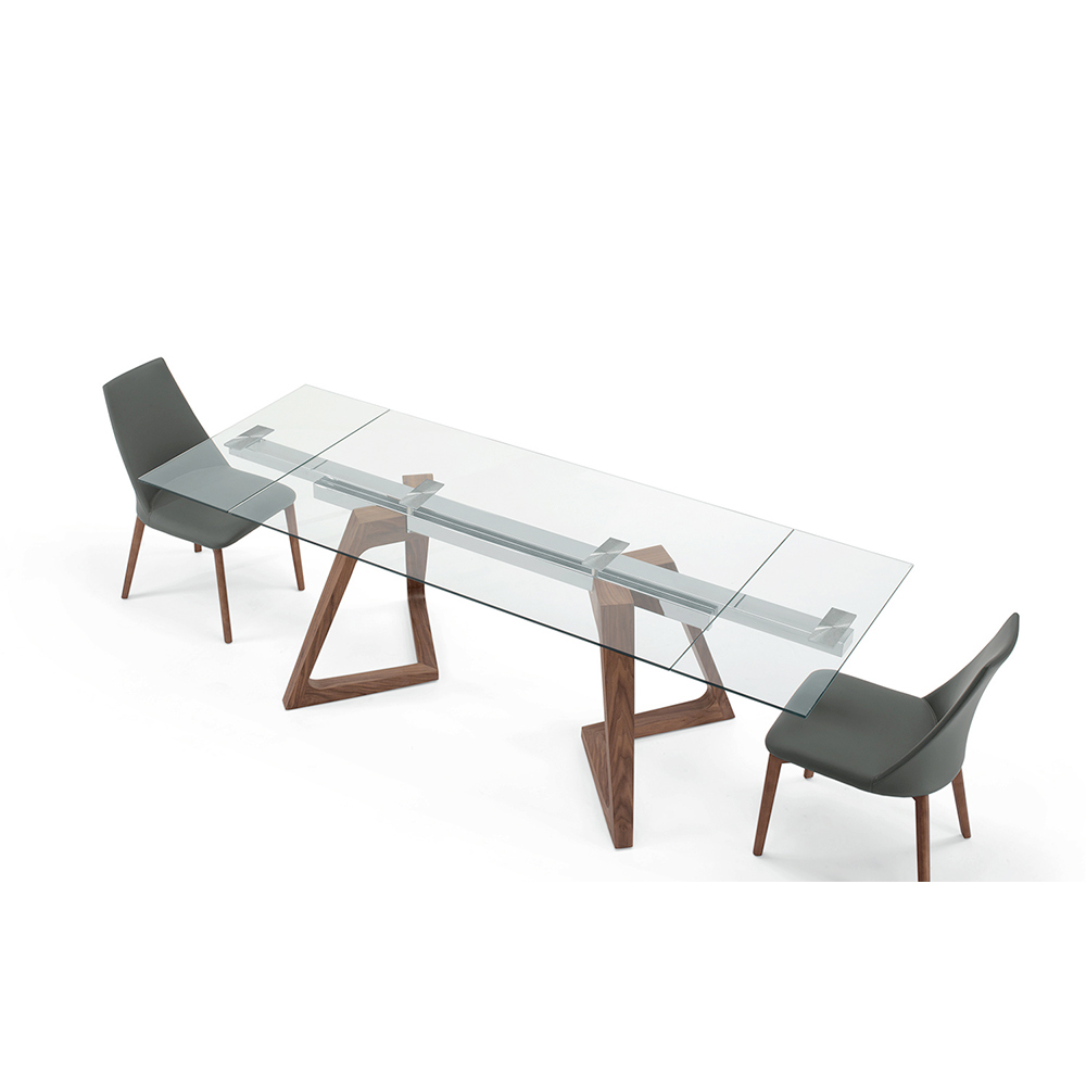 Moderní designový rozkládací dřevěný dýhovaný stůl až do 280 cm s deskou z průhledného skla.