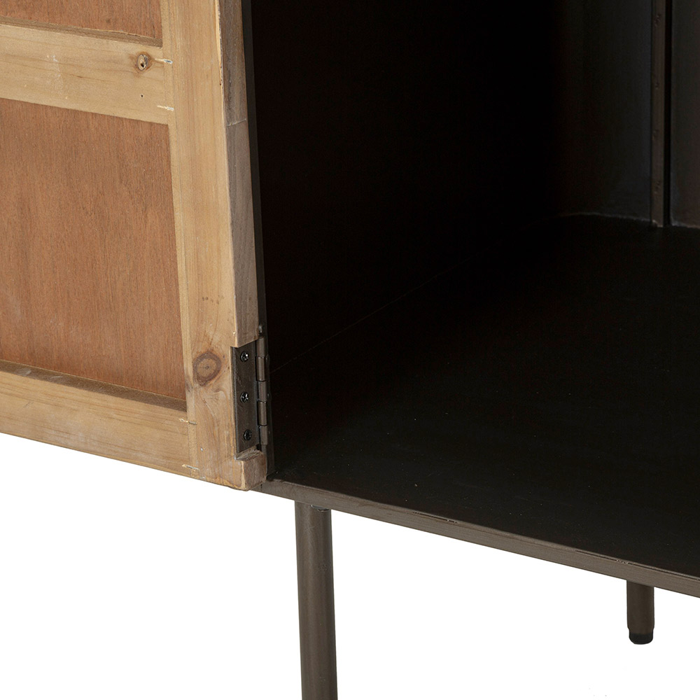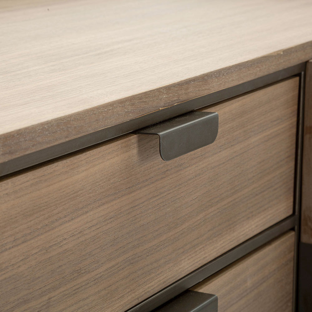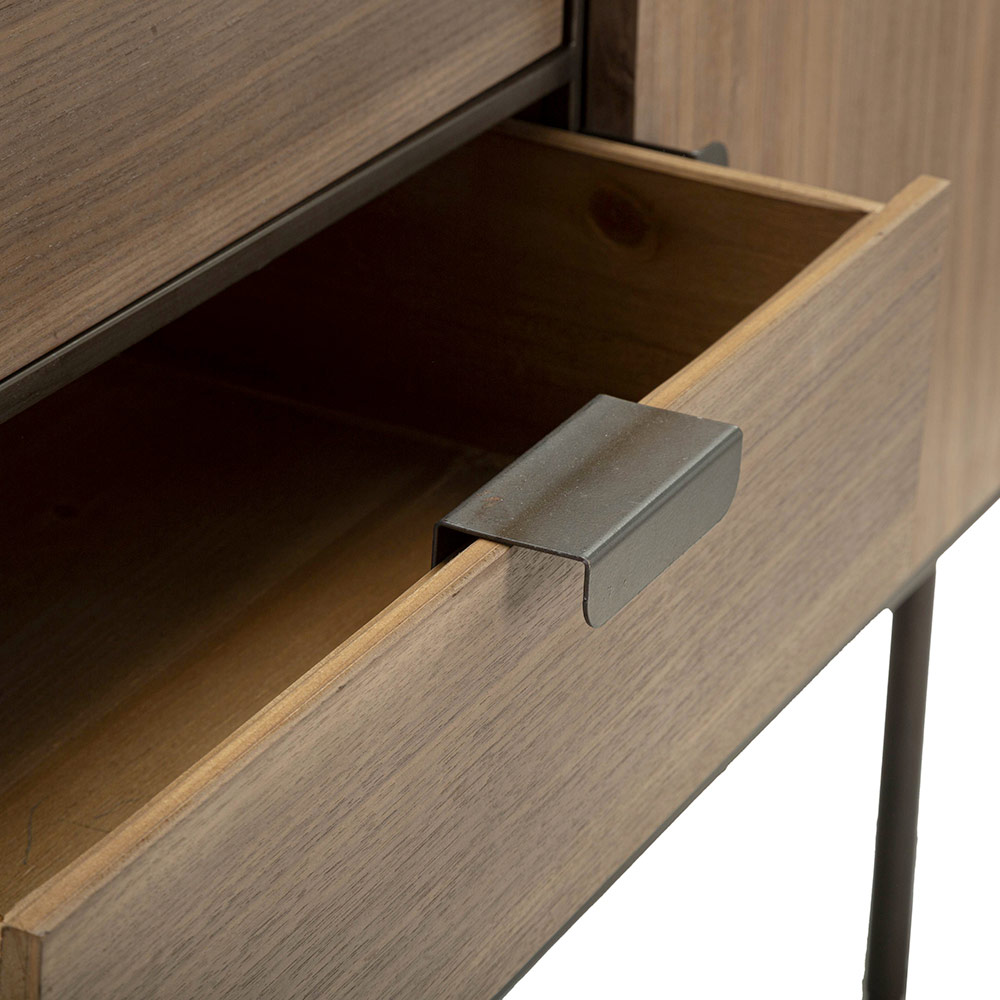 Tento příborník ze dřeva a železa je kvintesencem funkční elegance a vytříbeného designu. Se svými čistými liniemi a minimalistickým stylem se nenápadně hodí do každého prostředí a zároveň nabízí velkou plochu a užitečný prostor pro uložení drobných předmětů díky praktickým a snadno ovladatelným zásuvkám. Tmavá dřevěná povrchová úprava dodává pocit tepla a bohatství , zatímco robustní konstrukce zajišťuje odolnost a stabilitu .