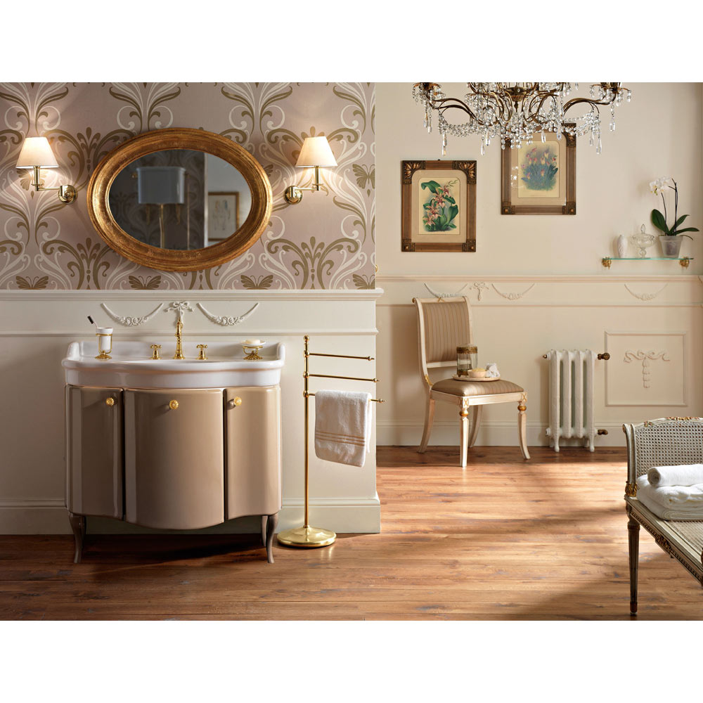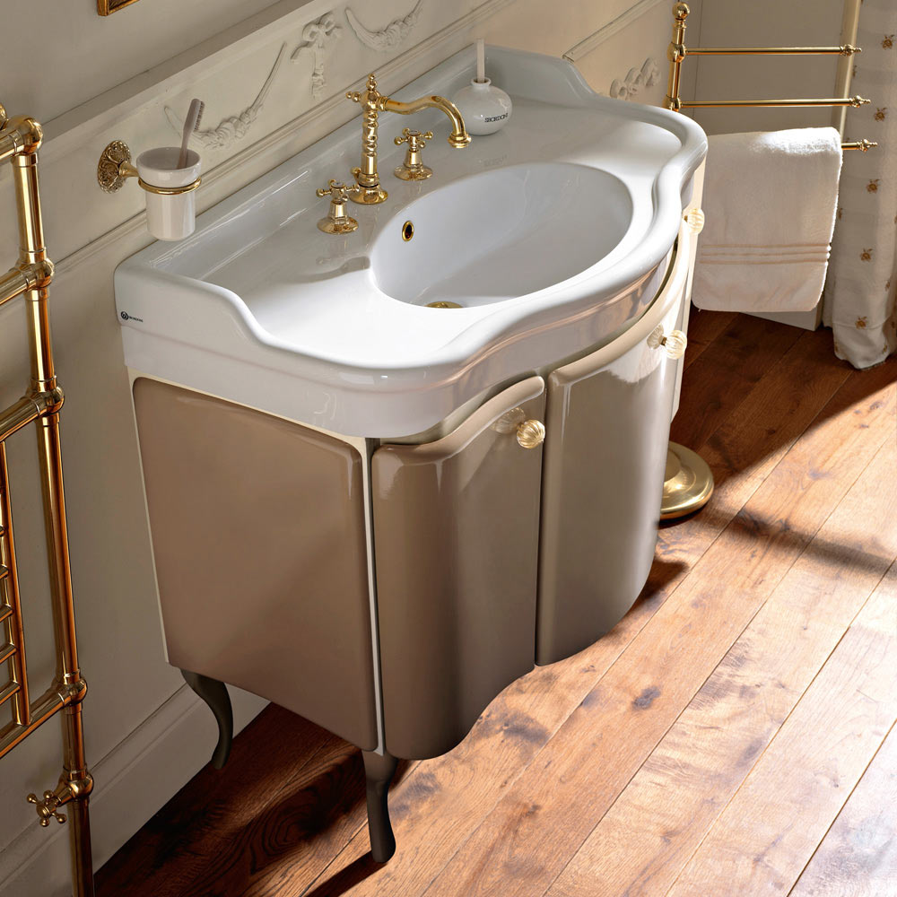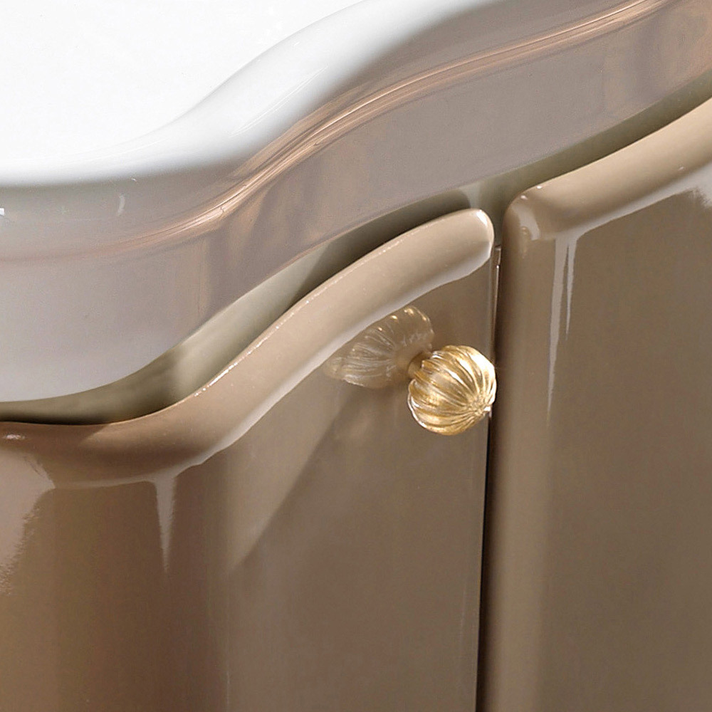 Koupelnová skříňka z MDF se dvěma dvířky a dvoubarevnou karamelově leskle lakovanou zásuvkou se strukturou slonové kosti , s bílým keramickým dřezem . Součástí jsou mosazné knoflíky a dřez .