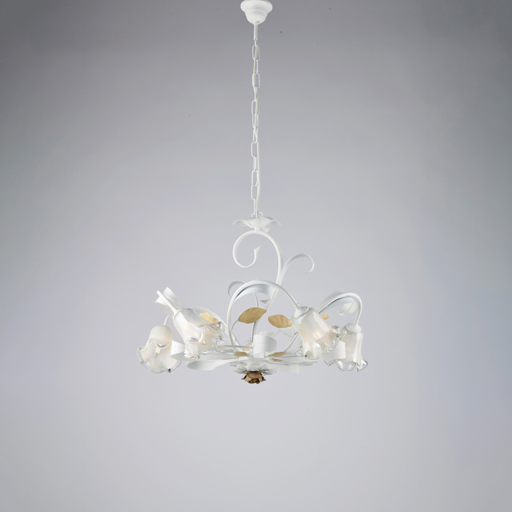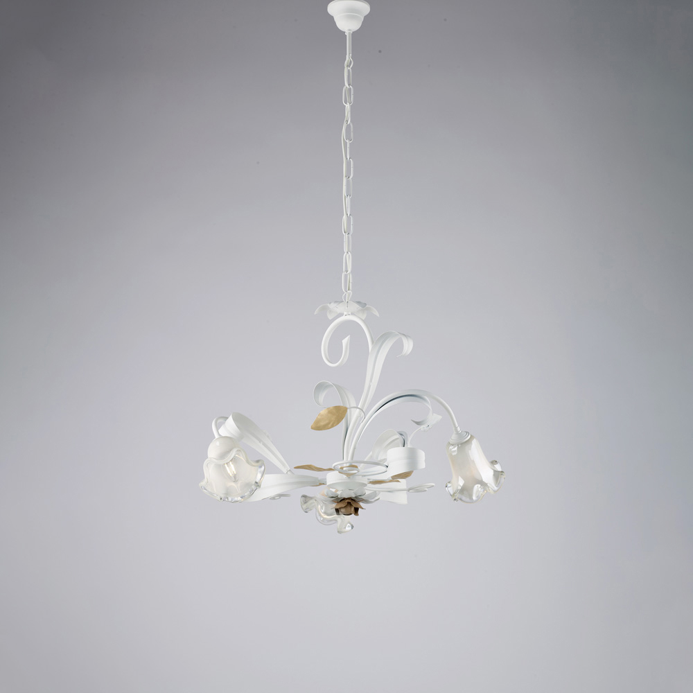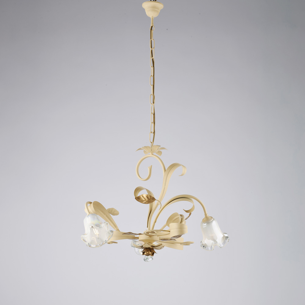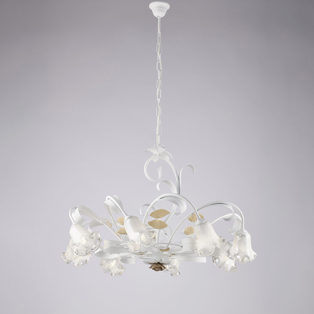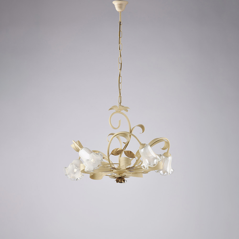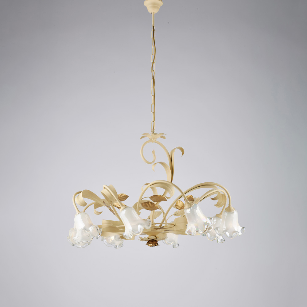 Romantický a elegantní, tento klasický lustr ručně vyrobený ze slonovinově lakovaného železa je zářivým výtvorem, který připomíná kouzlo italské tradice, interpretované s vytříbeným vkusem. Vlnitá struktura, obohacená o ozdobné kudrlinky a skleněné stínidlo ve tvaru květiny , dodává celkovému efektu lehkost a harmonii a vytváří teplou a příjemnou atmosféru.