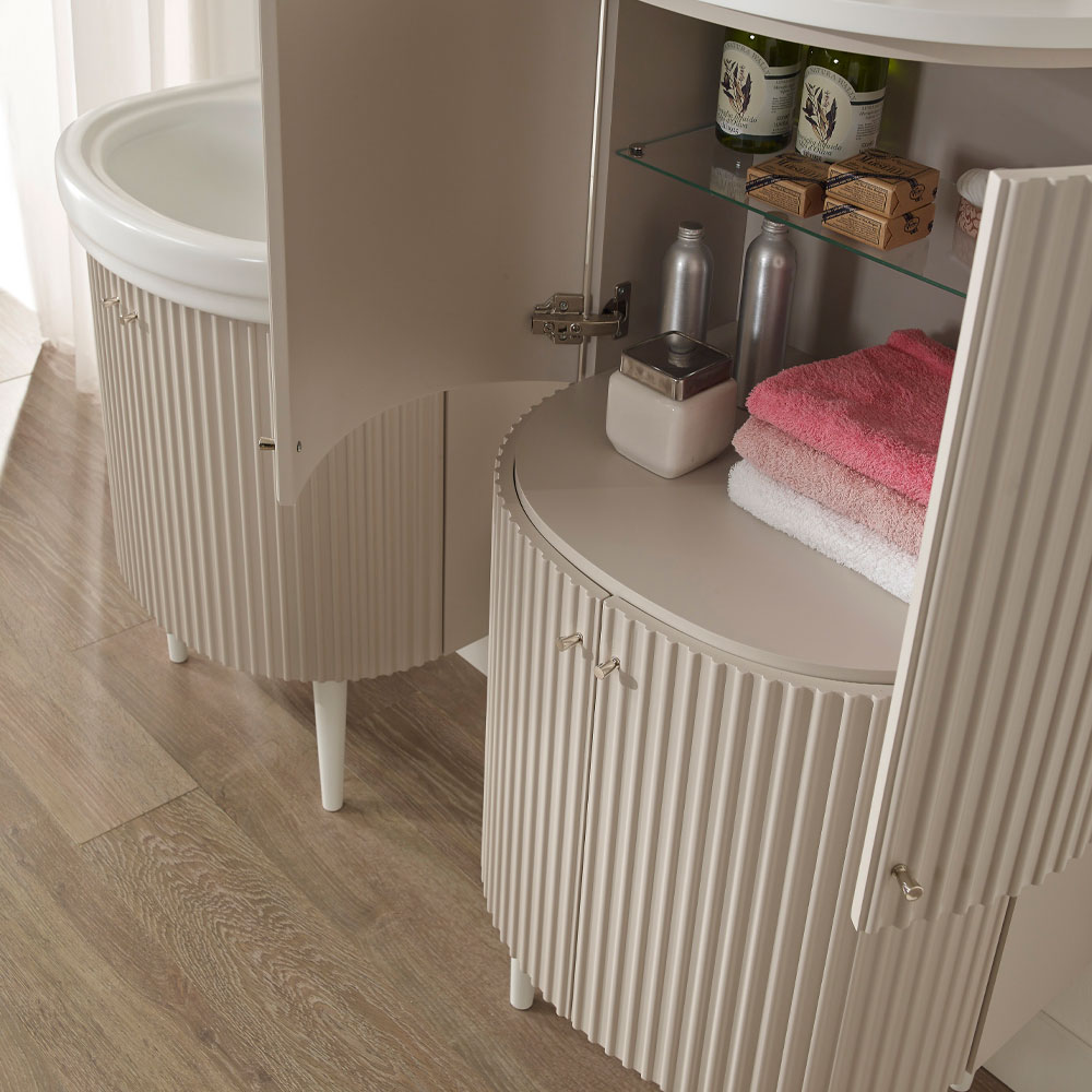 MDF vysoká jednotka se čtyřmi cannetté dvířky matný povrch v barvě noisette které uzavírají tři police, z toho dvě skleněné a jednu v Hydro MDF. Horní police a nohy jsou v matném bílém provedení a knoflíky jsou v niklovém provedení.