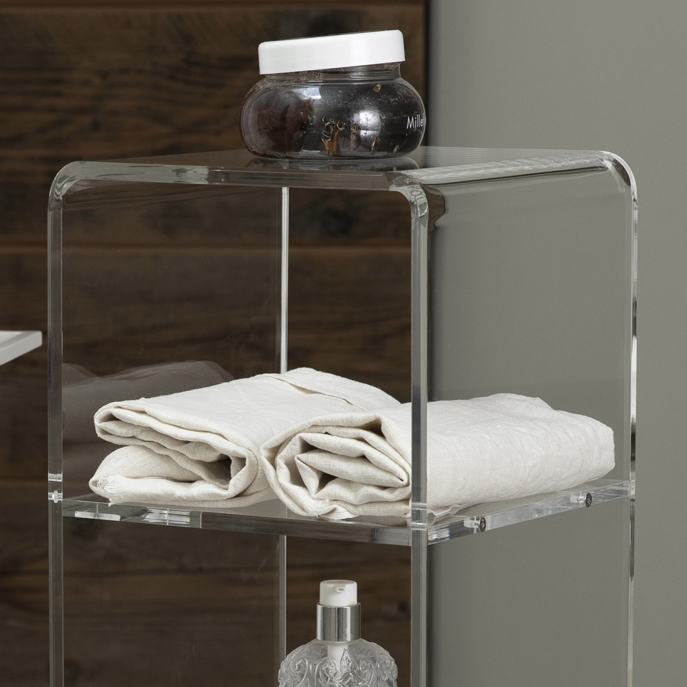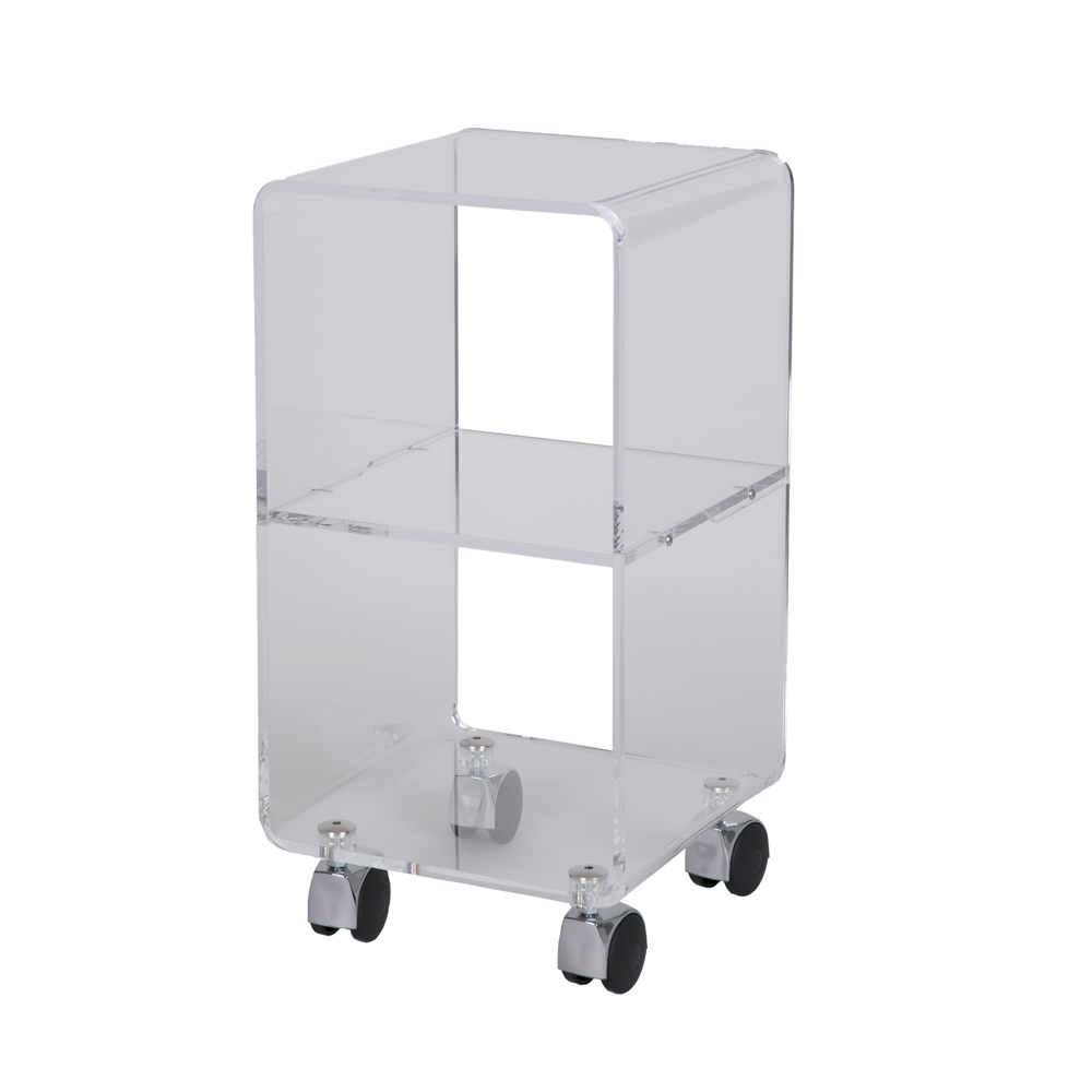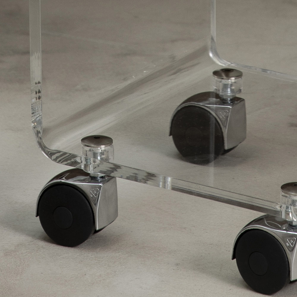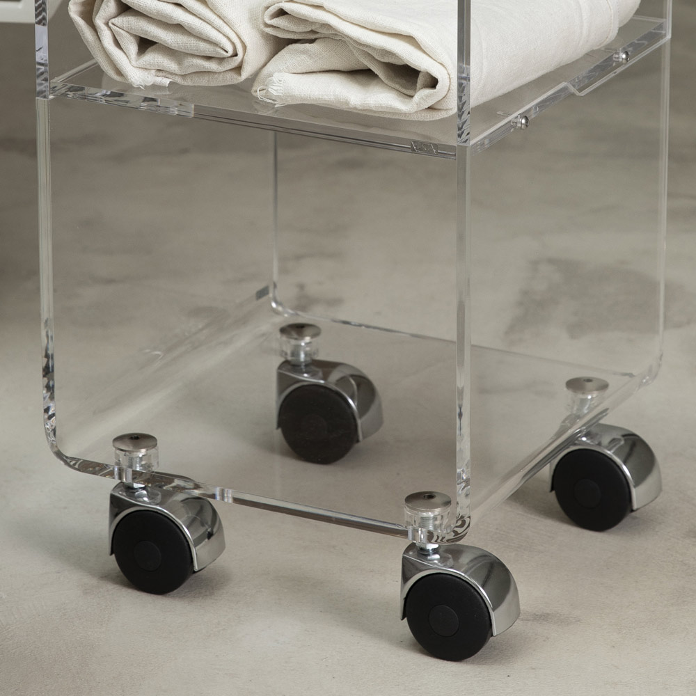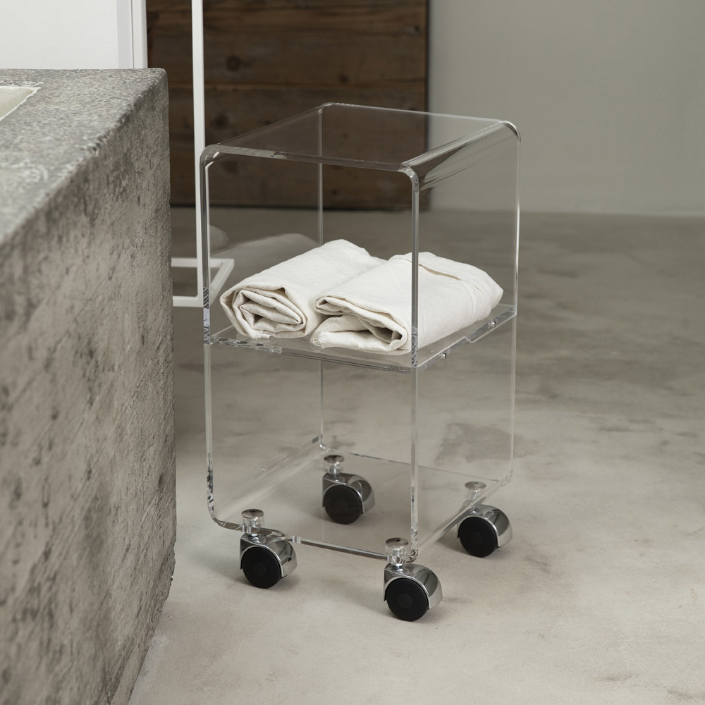 Sloupový vozík z průhledného akrylového krystalu s kolečky a 1 nebo 3 policemi, vyrobený v Itálii.