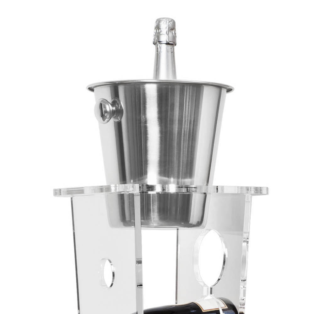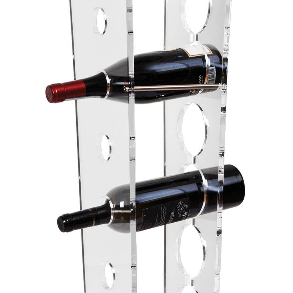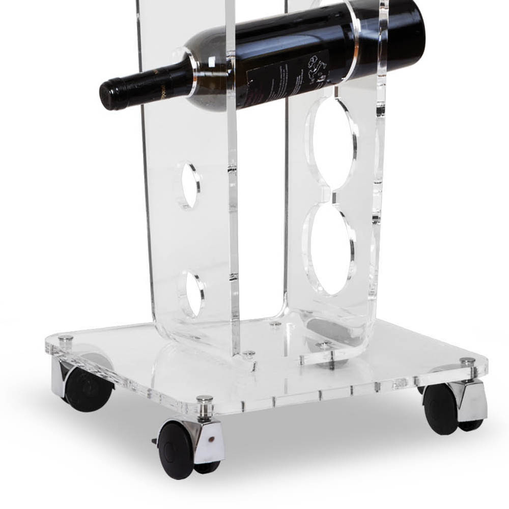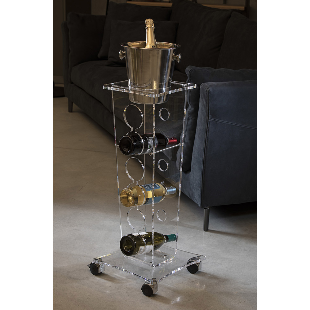 Volně stojící držák lahví na víno se vyznačuje elegantním designem na kolečkách vyrobených výhradně z průhledného akrylového křišťálu.