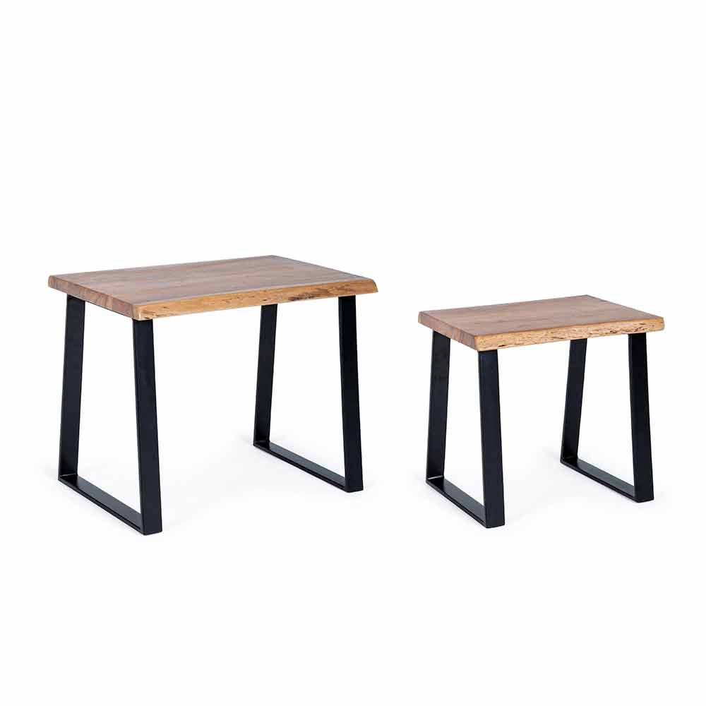 Dvojice moderních konferenčních stolků z akátového dřeva a oceli.