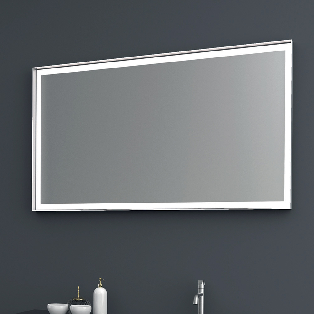 pískované zrcadlo s LED osvětlením na 4 stranách v kombinaci se starožitným platinovým lakovaným kovovým rámem.