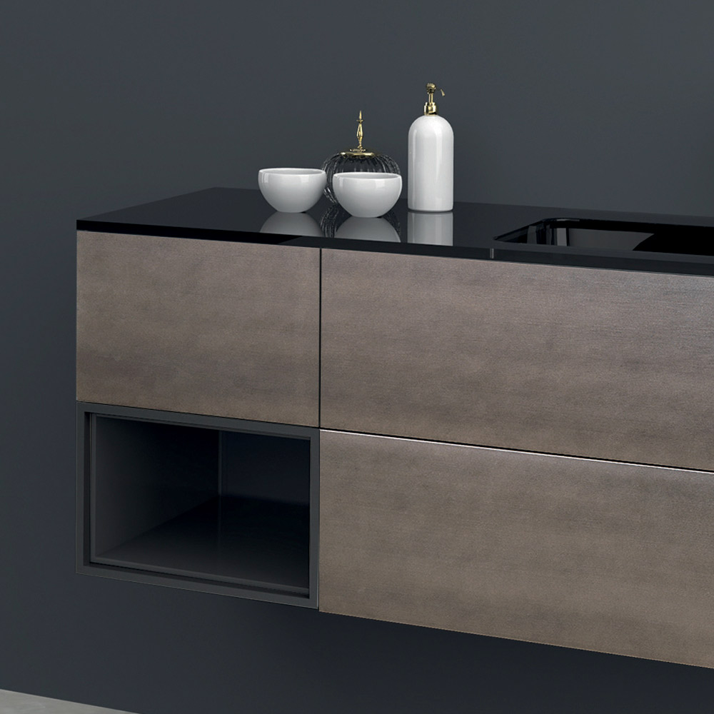 kompozice koupelnového nábytku se vyznačuje čistotou linií a vysoce rafinovaným povrchem.