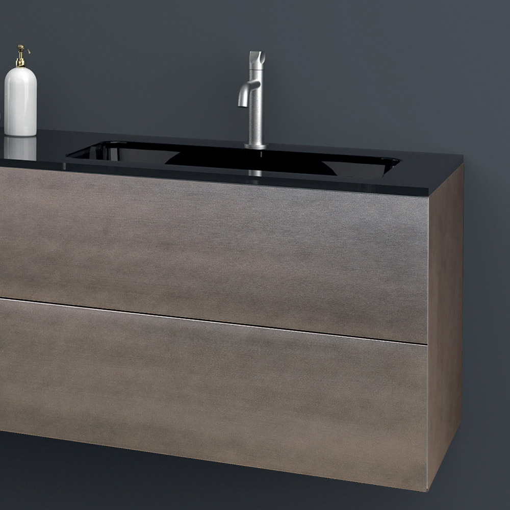 skleněnou desku s integrovaným lesklým černým umyvadlem.