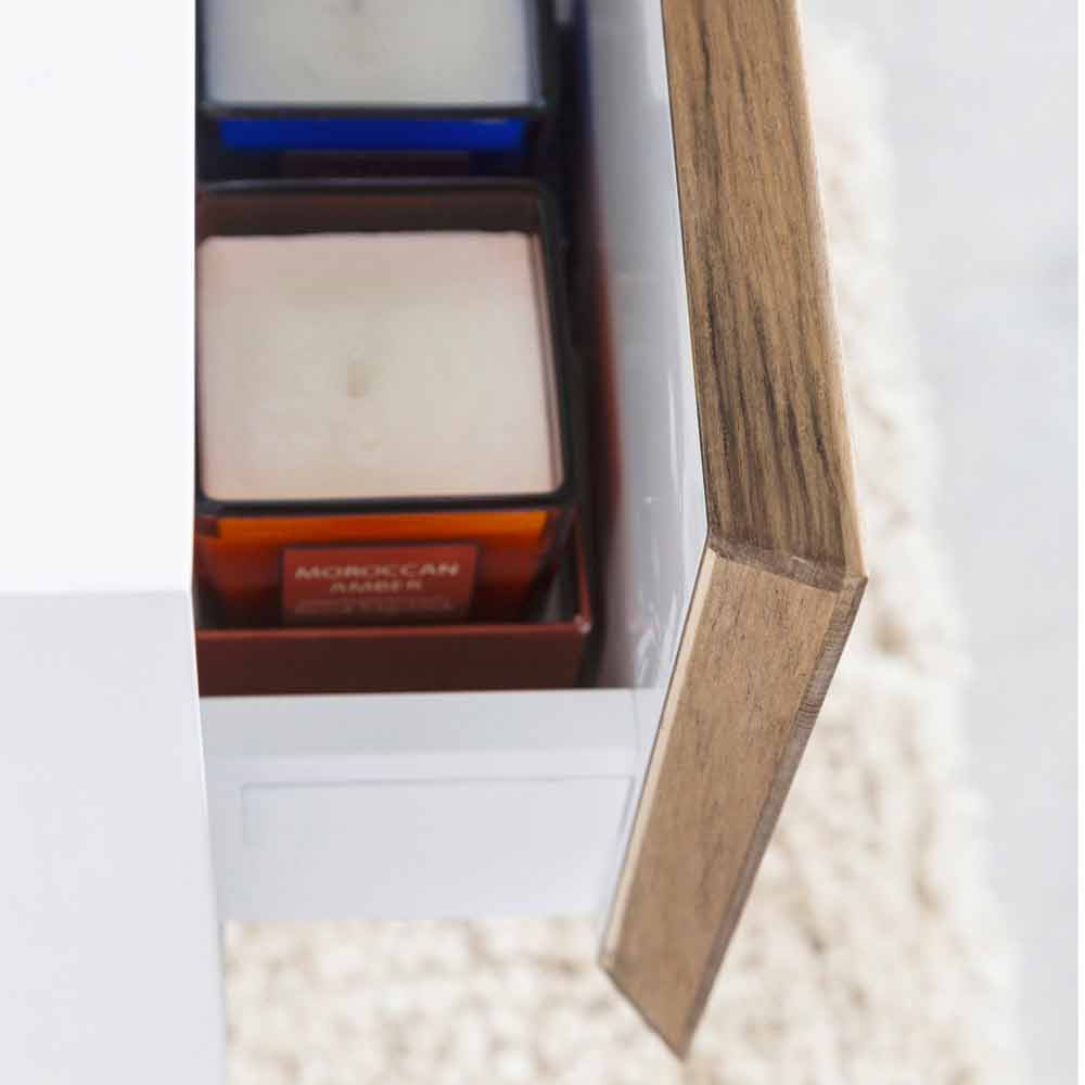 Závěsná koupelnová skříňka z Teak a Hi Macs® Barmský teak a jeho jemné a teplé odstíny se