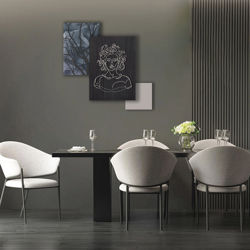 Složení tří panelů různých tvarů a velikostí, které kombinují laserové a tiskové dekorace . Skládá se ze tří tištěných dřevěných obrazů, z nichž dva jsou obdélníkové, jeden zobrazuje medúzy a další větve a menší jednobarevný čtvercový, kompozice je ideální pro dodání moderního stylu každé místnosti ve vašem domě.
