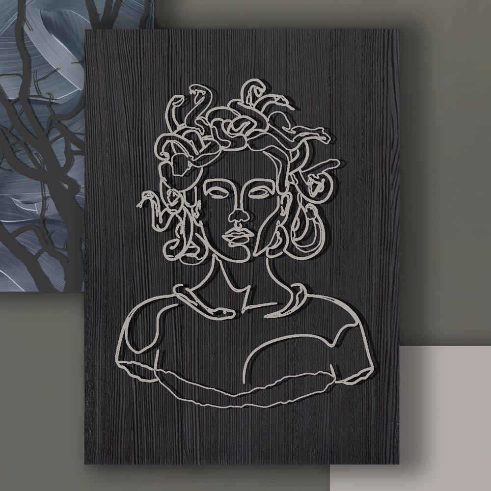 Složení tří potištěných dřevěných panelů zobrazujících Medúzu Made in Italy