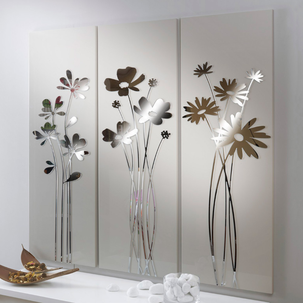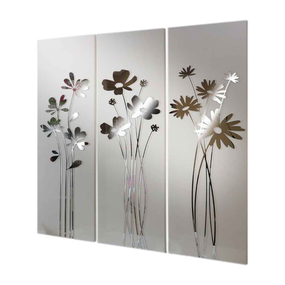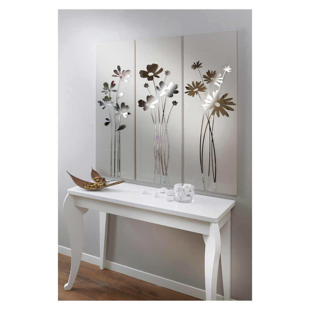 Složení 3 panelů k samostatnému zavěšení v lesklém pískovém lakovaném dřevě s aplikací v zrcadlovém plexi s vyobrazením kytic květin.