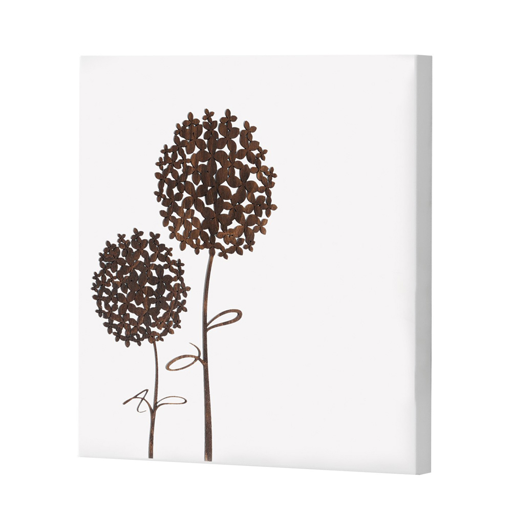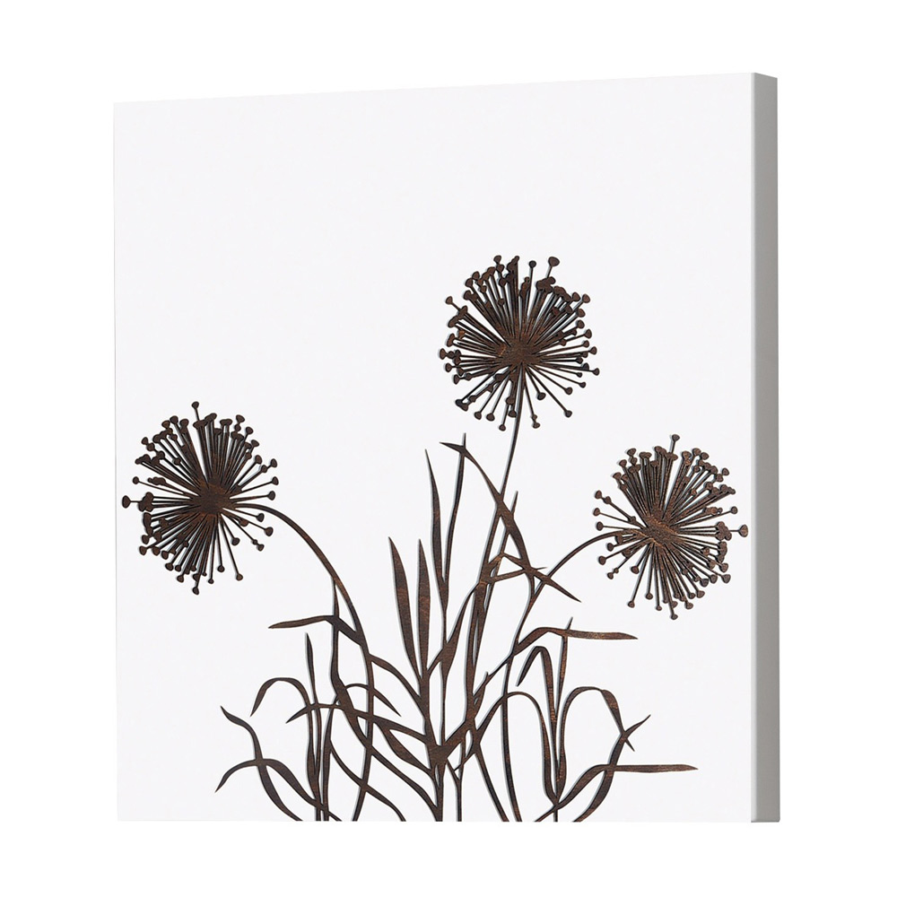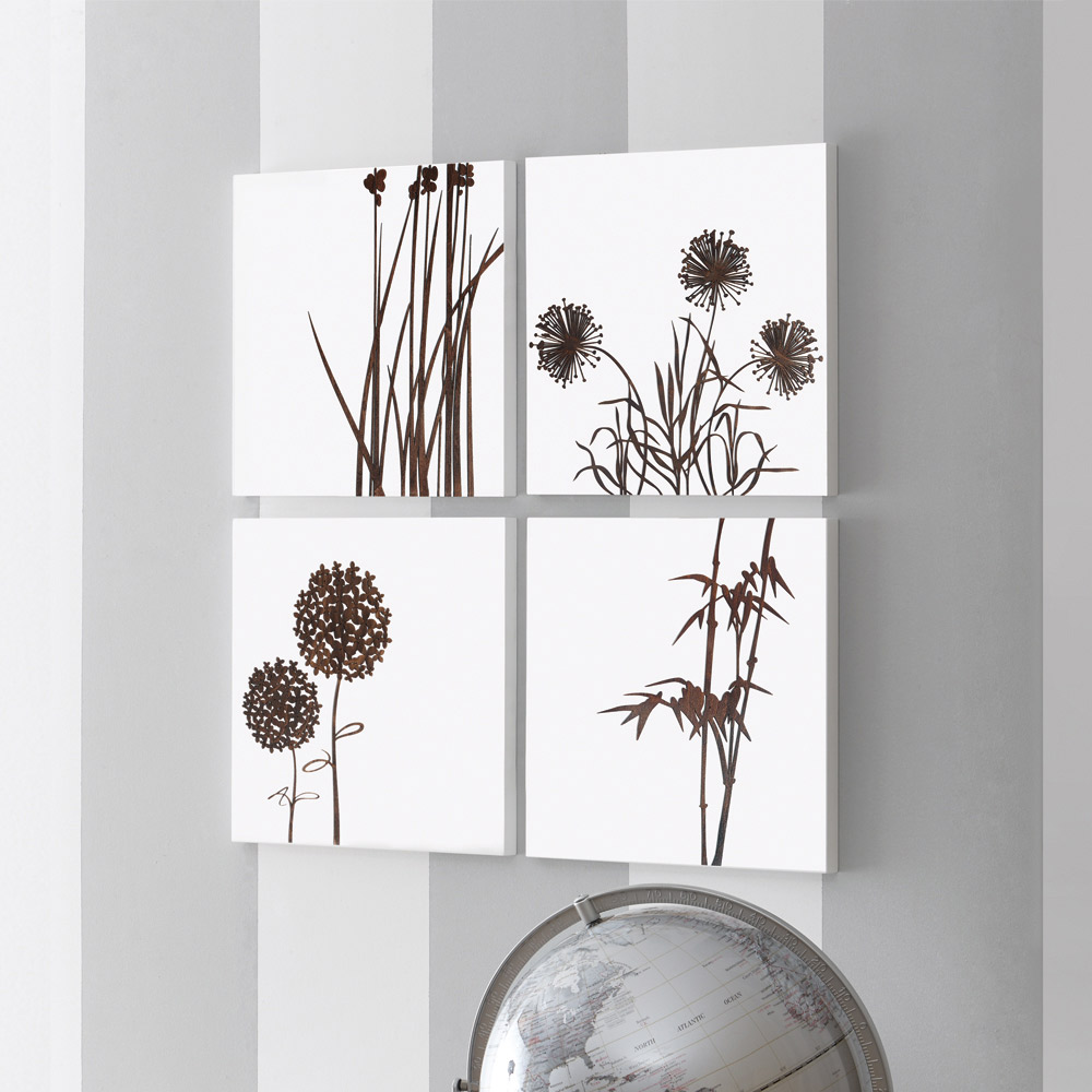 Složení 4 matně bílých panelů s gravírováním nebo zdobením ve dřevě wengé každý zobrazuje hortenzii, allium, thypu a bambusovou třtinu.
